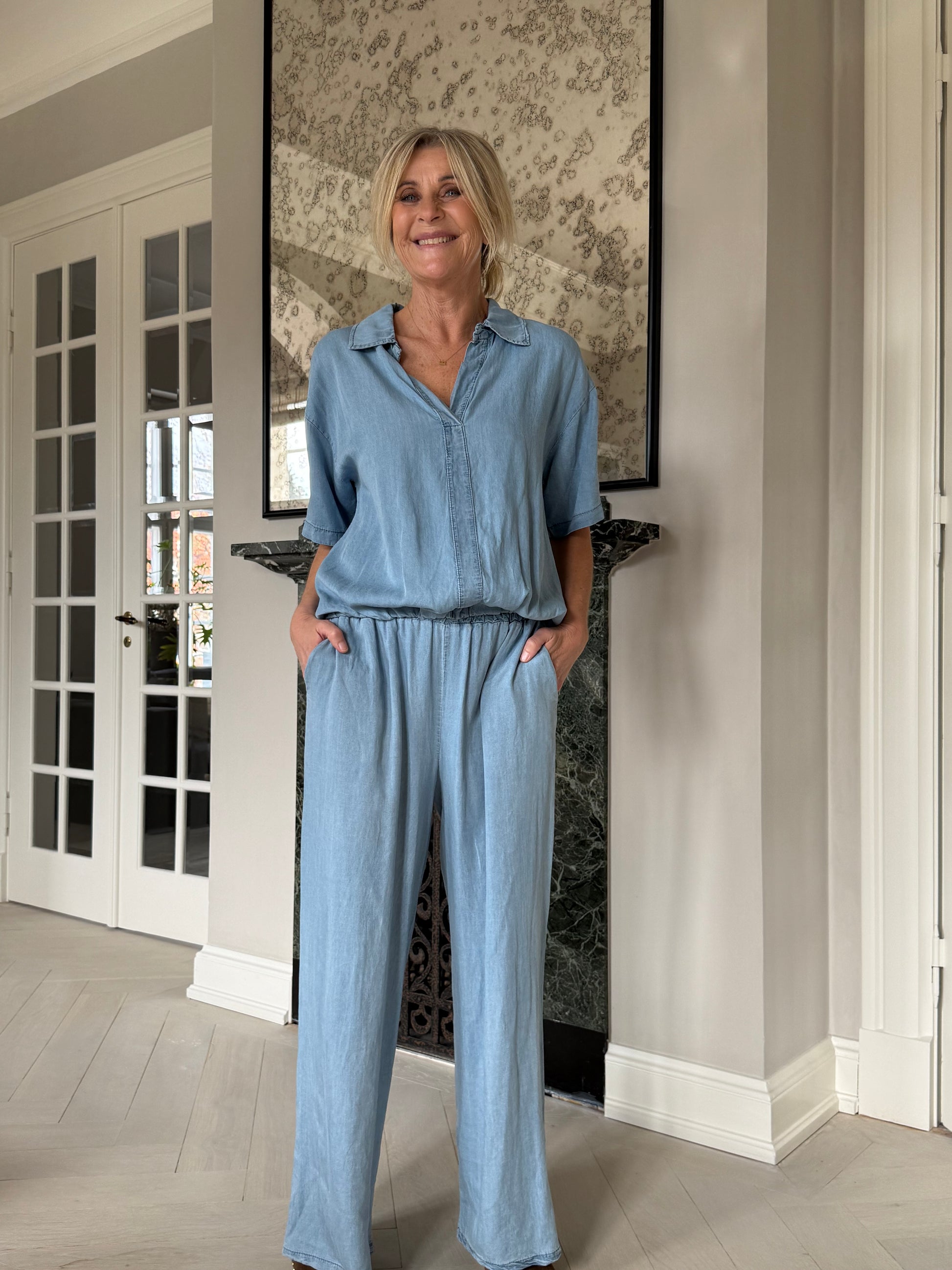 Slankebuks og lys bluse