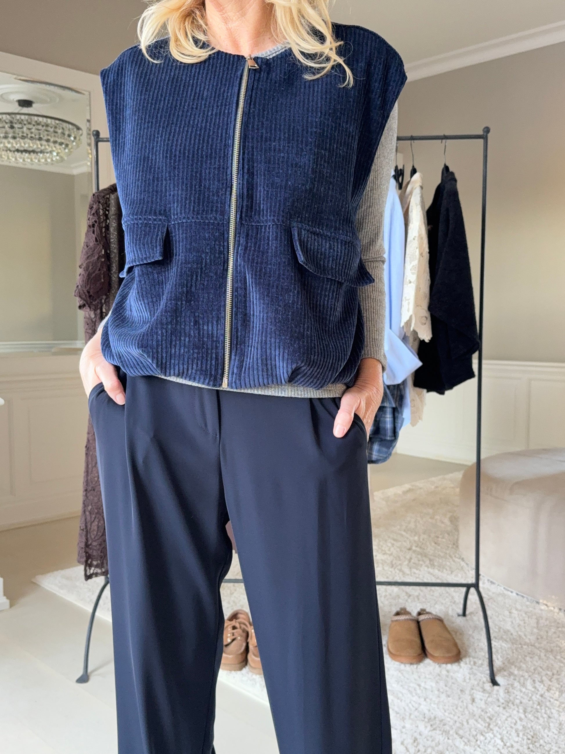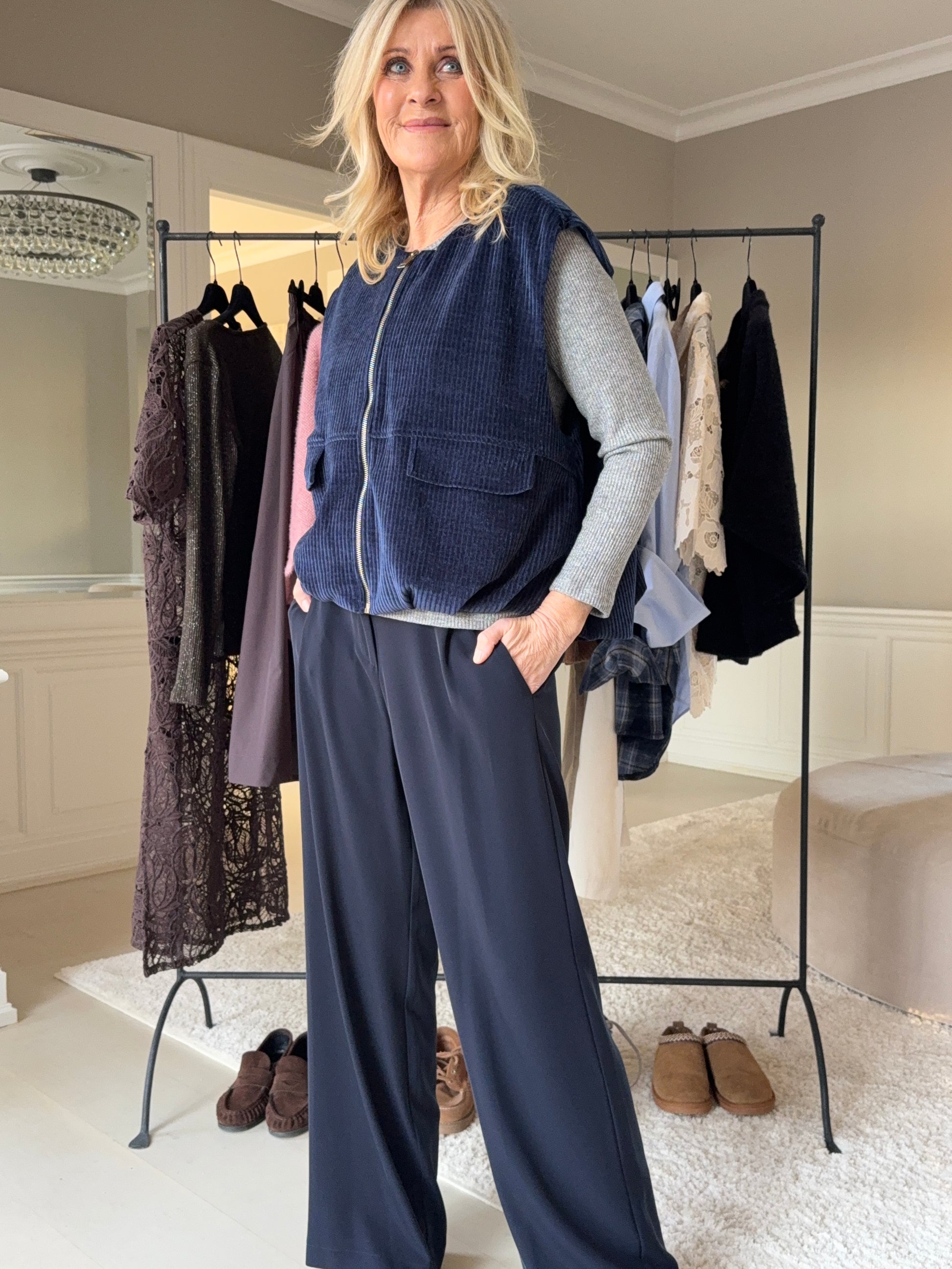 Blå fløjlsbukser og grå strik
