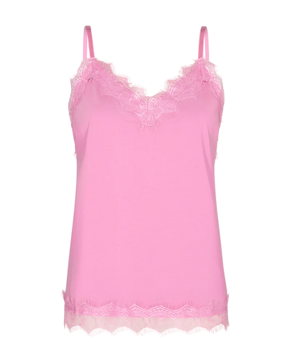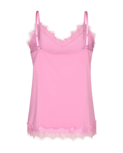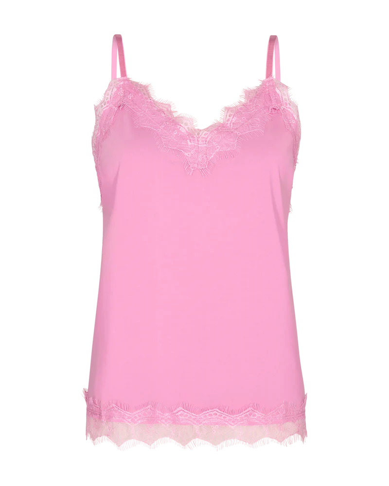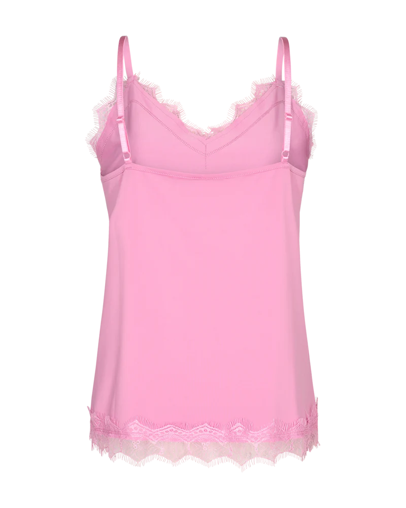 Den gode Bicco top fra Freequent er kommet i en lækker, pink farve til foråret og sommeren. Den populære top har feminine blonder i halsudskæringen samt i bunden. De smalle stropper er justerbare, så du selv kan styre, hvordan den skal sidde. Style til lyse bukser for et friskt sommerlook. Du kan med fordel sætte en blazer eller lys strik over, mens vejret er for koldt til at bruge toppen, som den er. Når sommeren så kommer, sætter du den til shorts og nederdele eller et par lækre hørbukser.