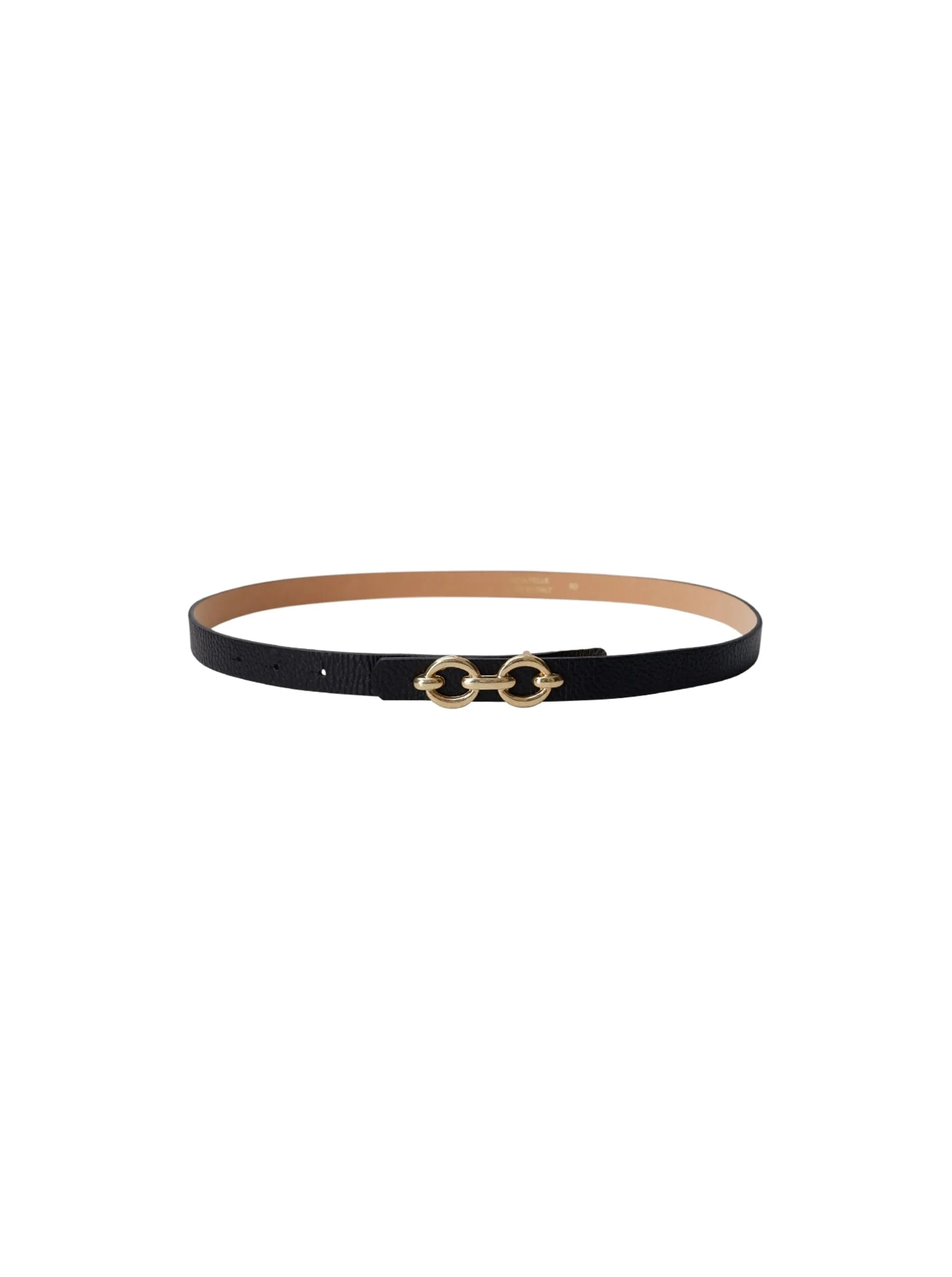 Smalt bælte fra Black Colour i sort læder. Bæltet har et gyldent bæltespænde, som giver et eksklusivt look. Style bæltet over dine kjoler eller i dine shorts og bukser.Mål:Lenght:S: 75 cmM: 85 cm.L: 95 cm.XL: 105 cm.