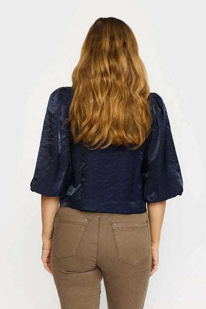 Elegant bolero jakke i en flot, mørkeblå farve. Jakken har de smukkeste ærmer med puf ved skulderen. De store knapper stofbetrukne, så du får et eksklusivt look. Style boleroen til dine kjoler, når du skal til fest, eller brug den til hverdag med bukser og en top.