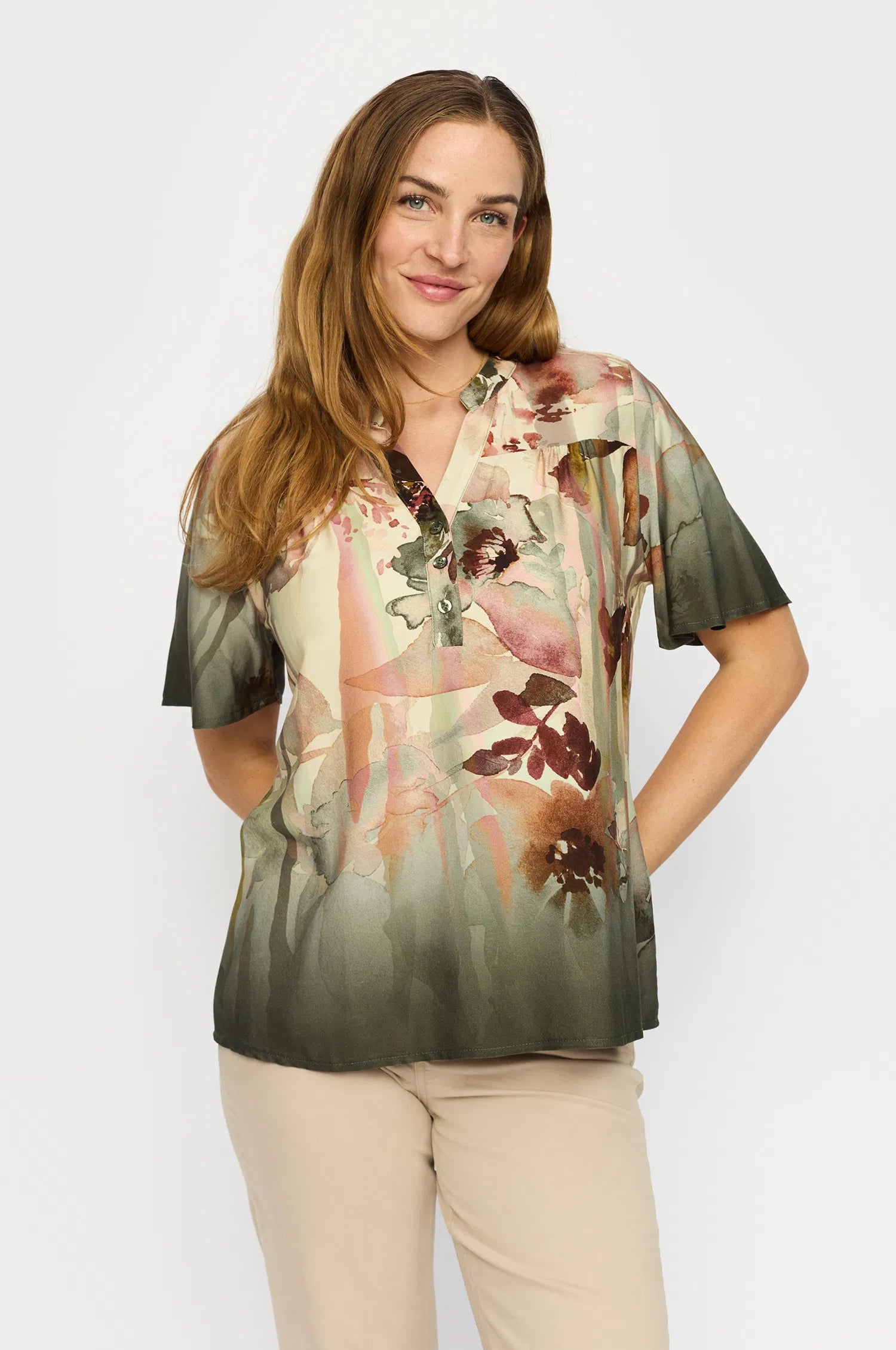 Skøn bluse fra 2-Biz i grønne toner. Blusen har knapper ned til brystet og korte ærmer. Style til sandfarvede bukser som på billedet eller til et par søde shorts.