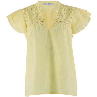 Super sød sommerbluse fra Continue i lysegul bomuld. Blusen har de fineste flæseærmer og en flot broderie anglaise detalje på forstykket. Den gule bluse er flot til denim og hvide bukser. Skal der mere kontrast på dit outfit, sætter du den gule farve til dine sorte bukser eller shorts. Det giver et flot sommerlook sammen med et par flade, sorte sandaler.