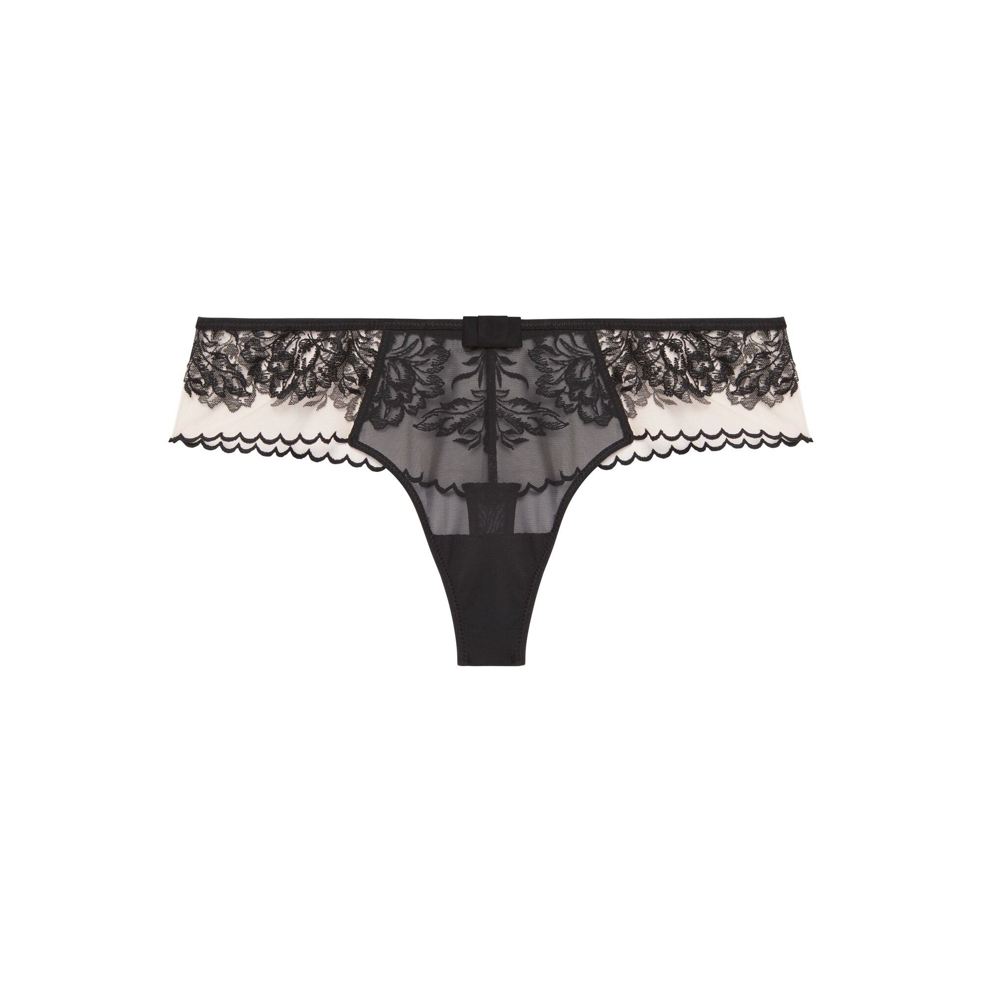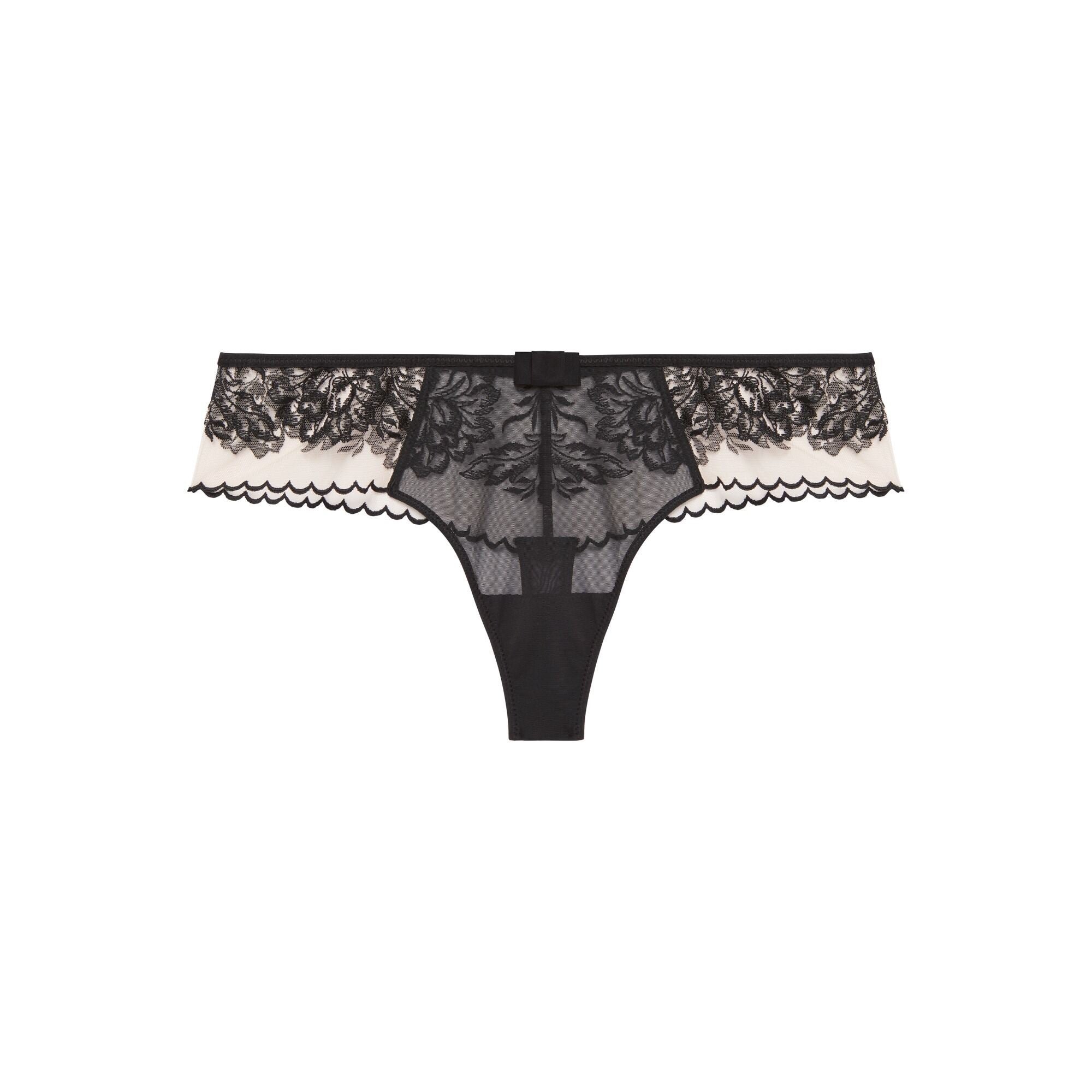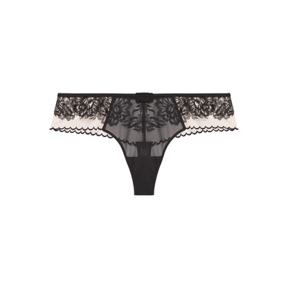 Vanvittig smuk g-streng fra Simone Pérèle i sort mesh. Trussen har en bred kant med fine bølger, så du får fornemmelsen af ren og skær luksus. De fine broderier fortsætter om bagpå, og så er trussen afsluttet med en lille sløjfe i ren pariser stil. Sæt den smukke Romance bh til og kombiner med hipsteren, hvis du gerne vil have en ekstra trusse til dit sæt.