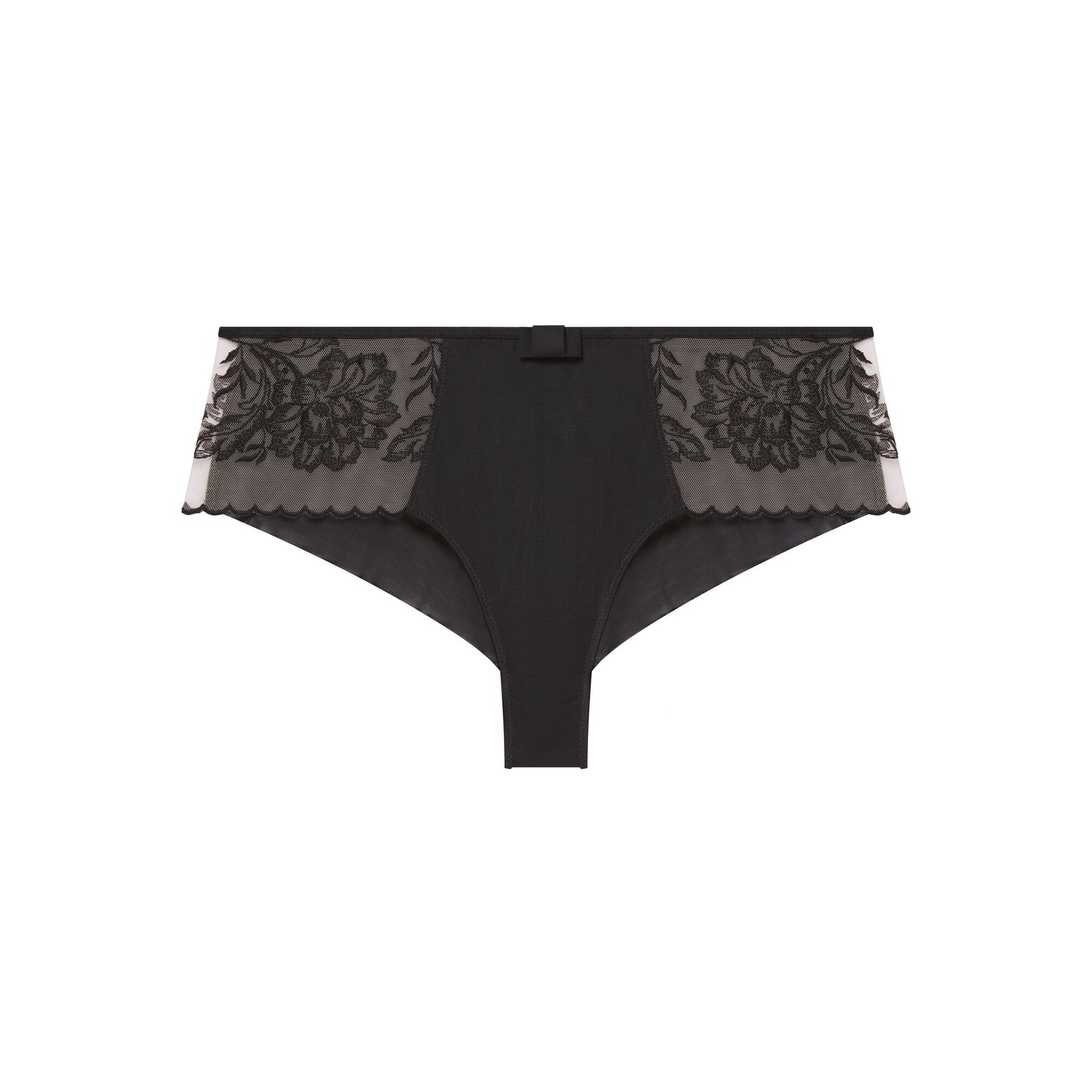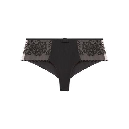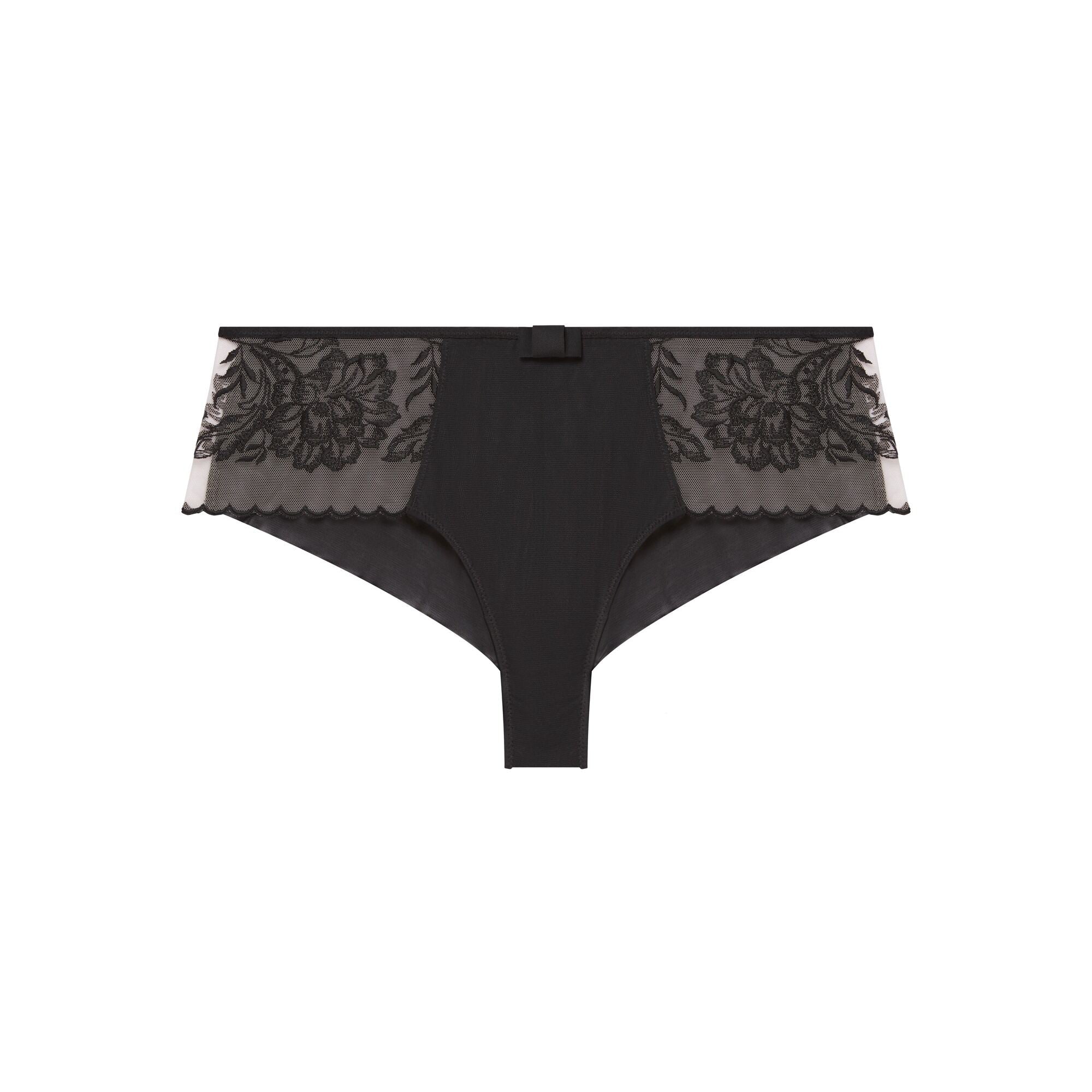 Feminin og elegant hipster fra Simone Pérèle. Den sorte hipster er i glat mikrofiber bagpå, og så har du alle de smukke broderie detaljer foran. Den smukke bølgekant og lille sløjfe, giver dig fornemmelsen af parisisk lingeri i særklasse. Sæt den smukke Romance bh til, så du får et helt sæt. Du kan også vælge at sætte string trussen til, som en ekstra trusse, hvis du gerne vil have lidt at skifte mellem.