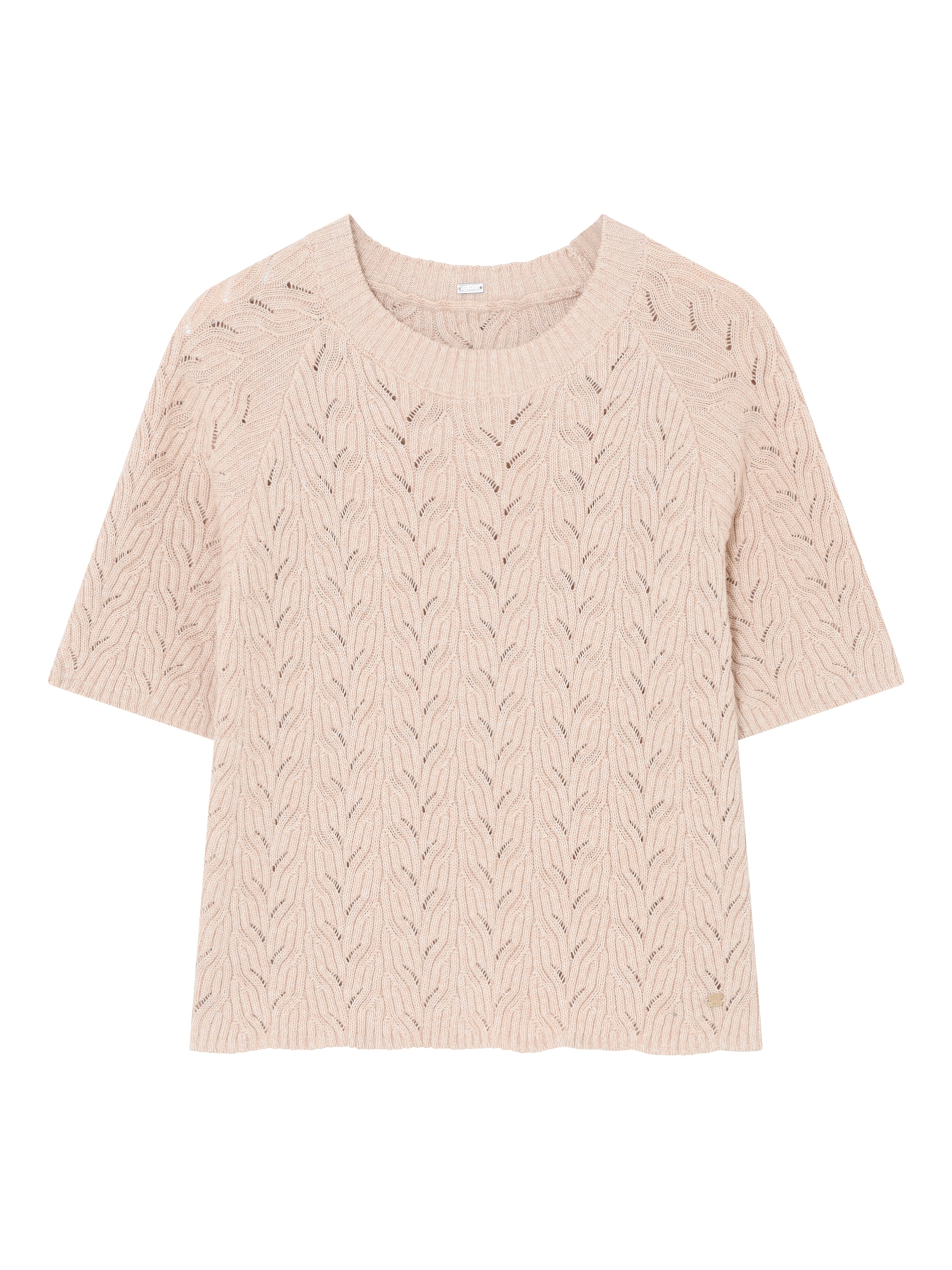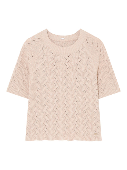Den pudderfarvede strikbluse fra Gustav har korte ærmer og et fint hulmønster. Halsudskæringen er rund og blusen har en fin længde. Det betyder, at du sagtens kan style med et bælte, som du ser på billedet.