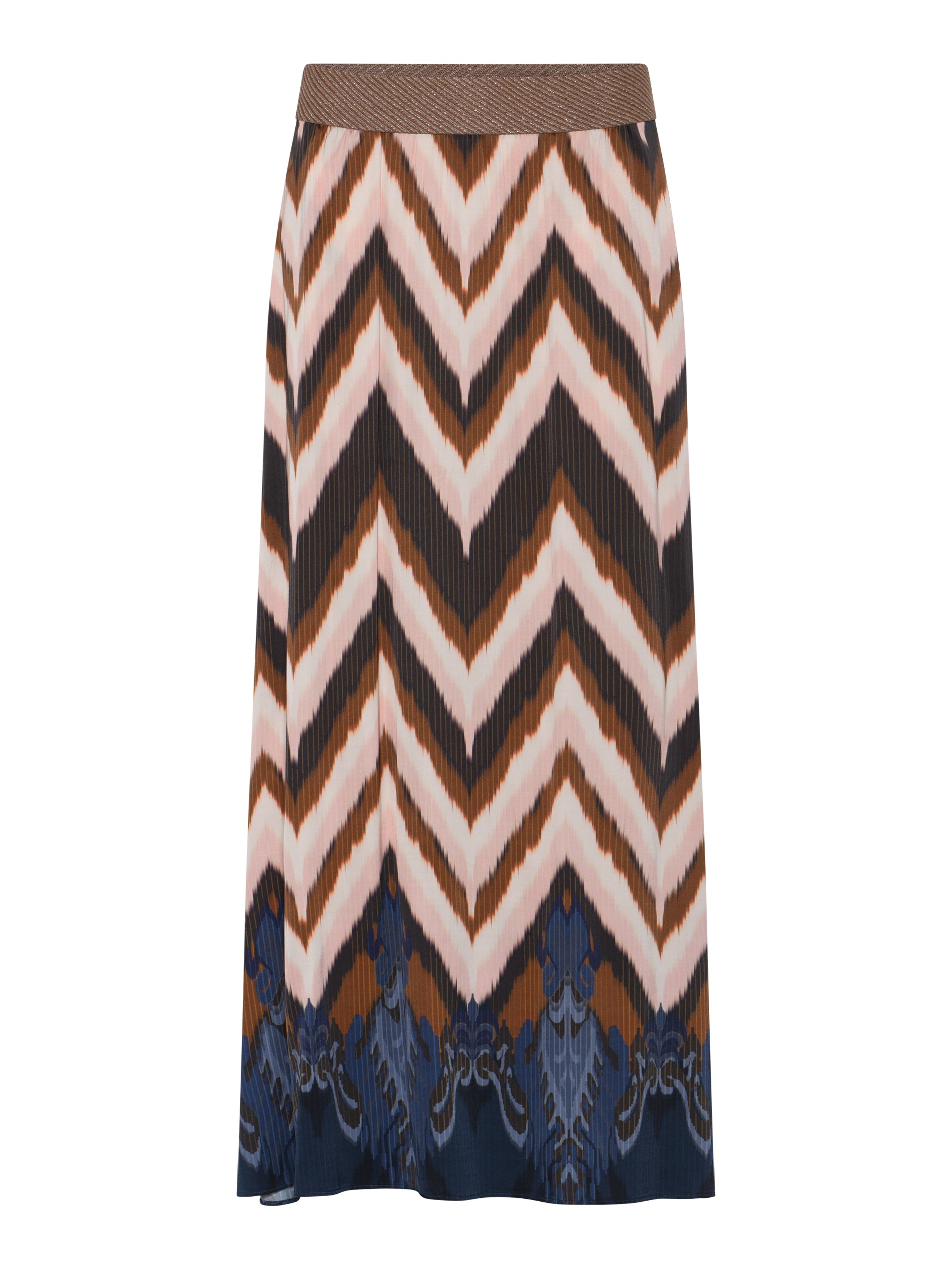 Mangler du en lækker, lang nederdel? Den flotte Gustav nederdel har et fint zigzag mønster i brune og rosa toner. Bunden er mørkeblå og står i flot kontrast til det lyse mønster. Den gode lurex linning gør nederdelen behagelig at have på. Style med en lys strik eller med den søde Mariella bluse.