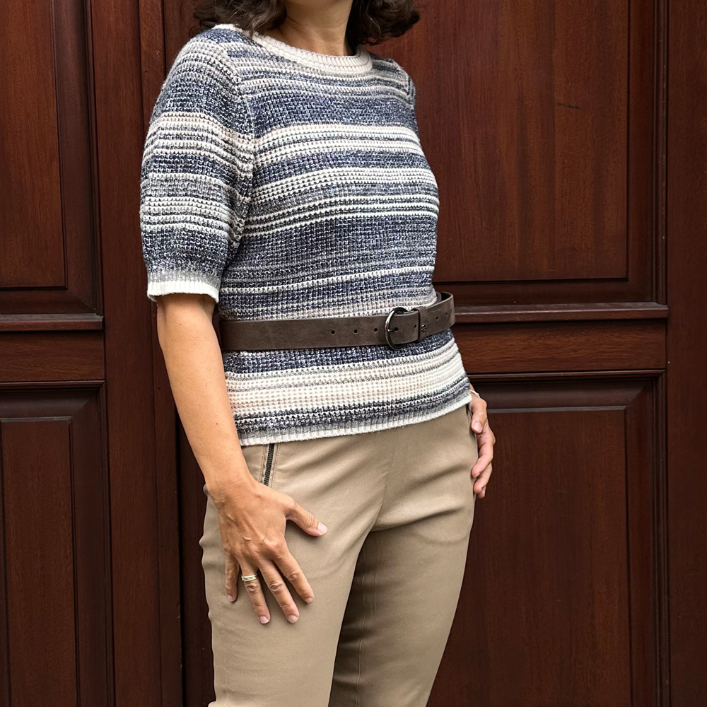 Den gode Shanne strik fra Gustav er stribet i blå og lyse toner. Ærmerne er korte og afsluttet med ribkant, så de sidder flot ind til armen. De smalle lurex striber giver strikken et elegant look. Style til lyse skindbukser, som du ser på billedet. Strikken er også flot til et par jeans eller mørkeblå bukser.