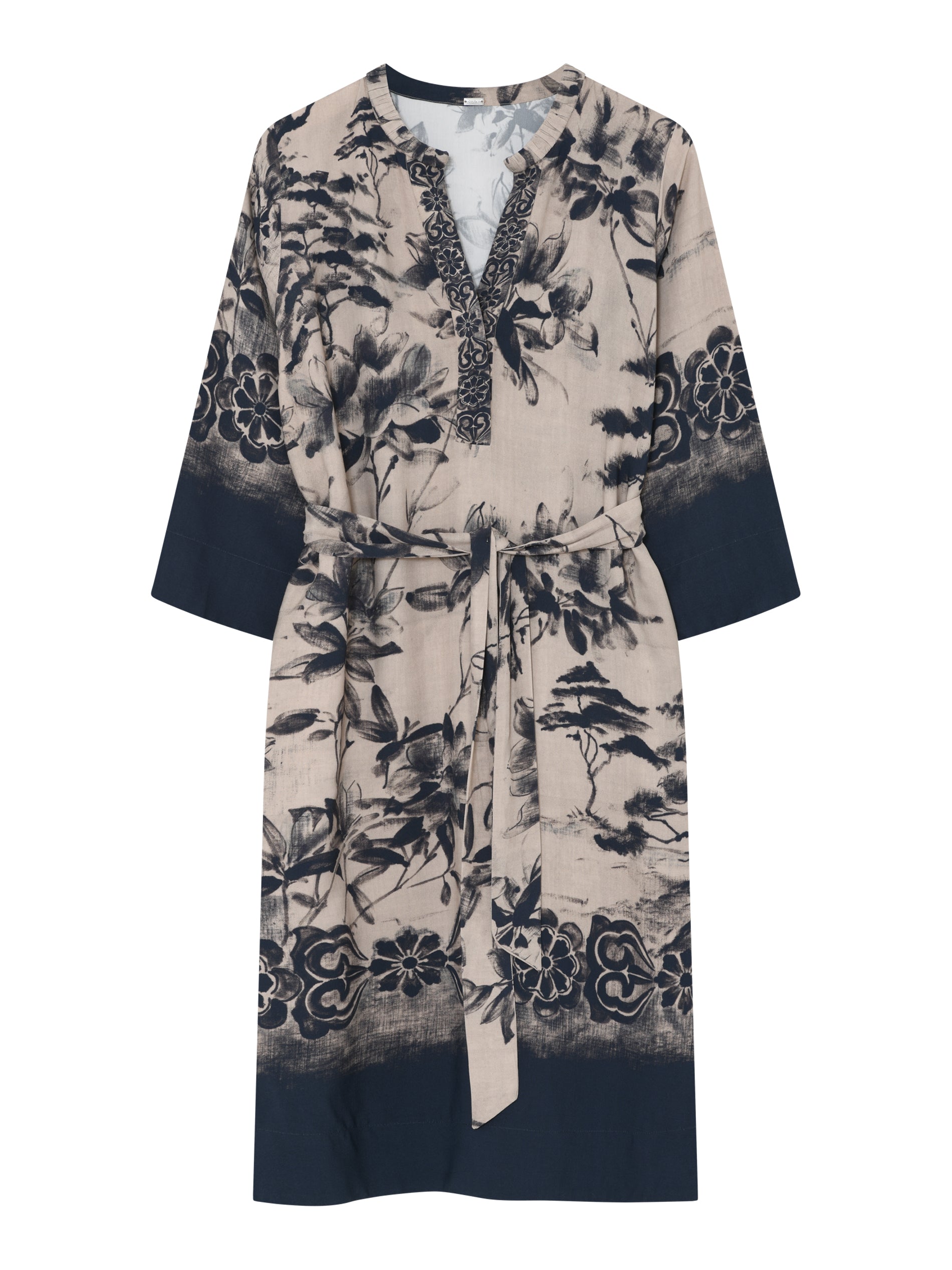 Den populære Costa kjole fra Gustav er kommet i et flot sandfarvet print. De blå detaljer ved manchetter og i bunden giver en fin kontrast til den lyse kjole. Costa kjolen bindes i livet, så du sætter flot fokus på taljen. Du kan bruge kjolen som den er, men du kan også vælge at style over de matchende Phi bukser.