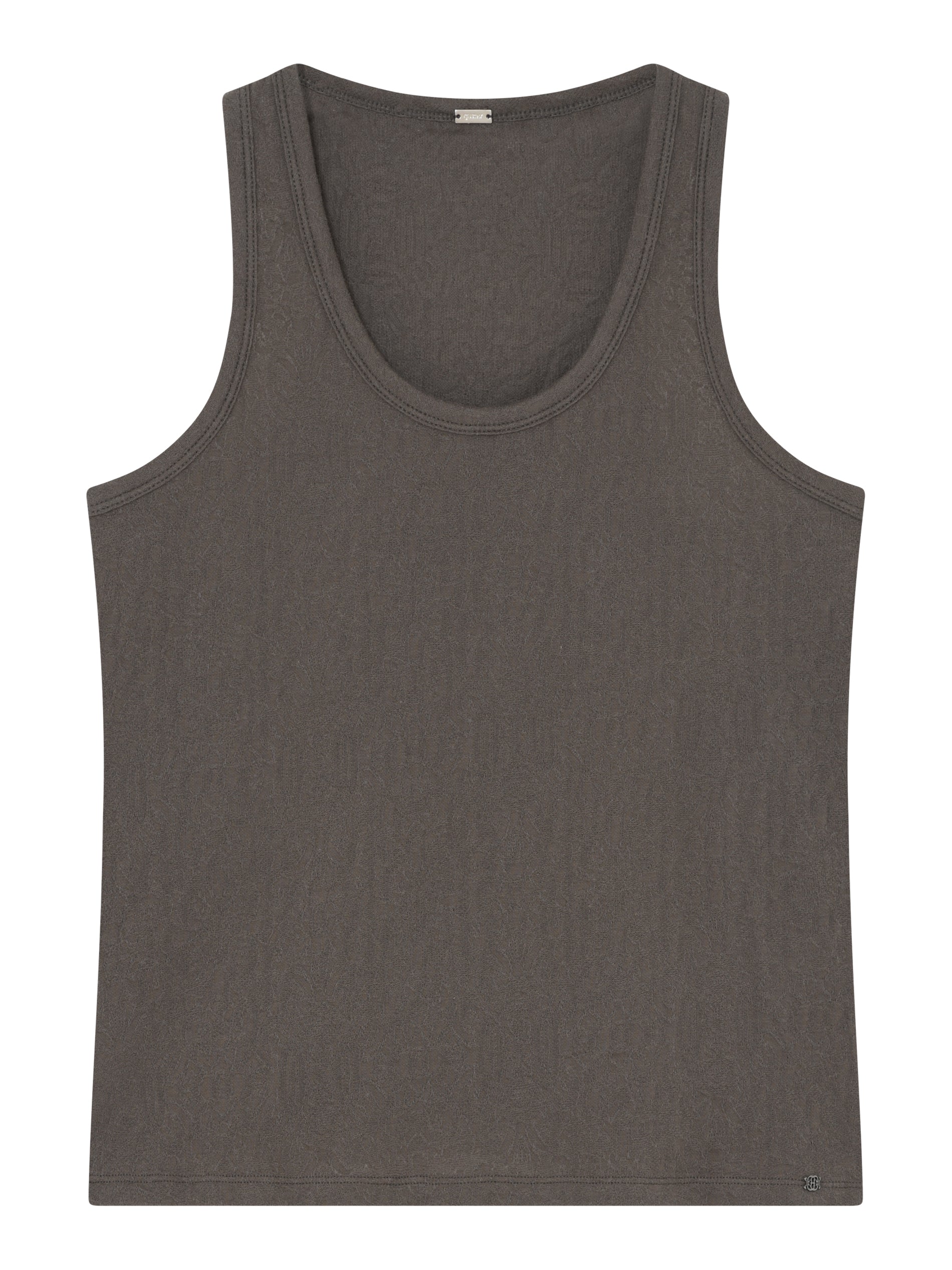 Flot jacquard top fra Gustav i en lækker, mørkebrun farve. Toppen er lavet som en klassisk tanktop, der sidder til. Materialet er blødt og strækbart, så toppen er dejlig at have på. Style til dine bukser og nederdele med en vest eller strik over.