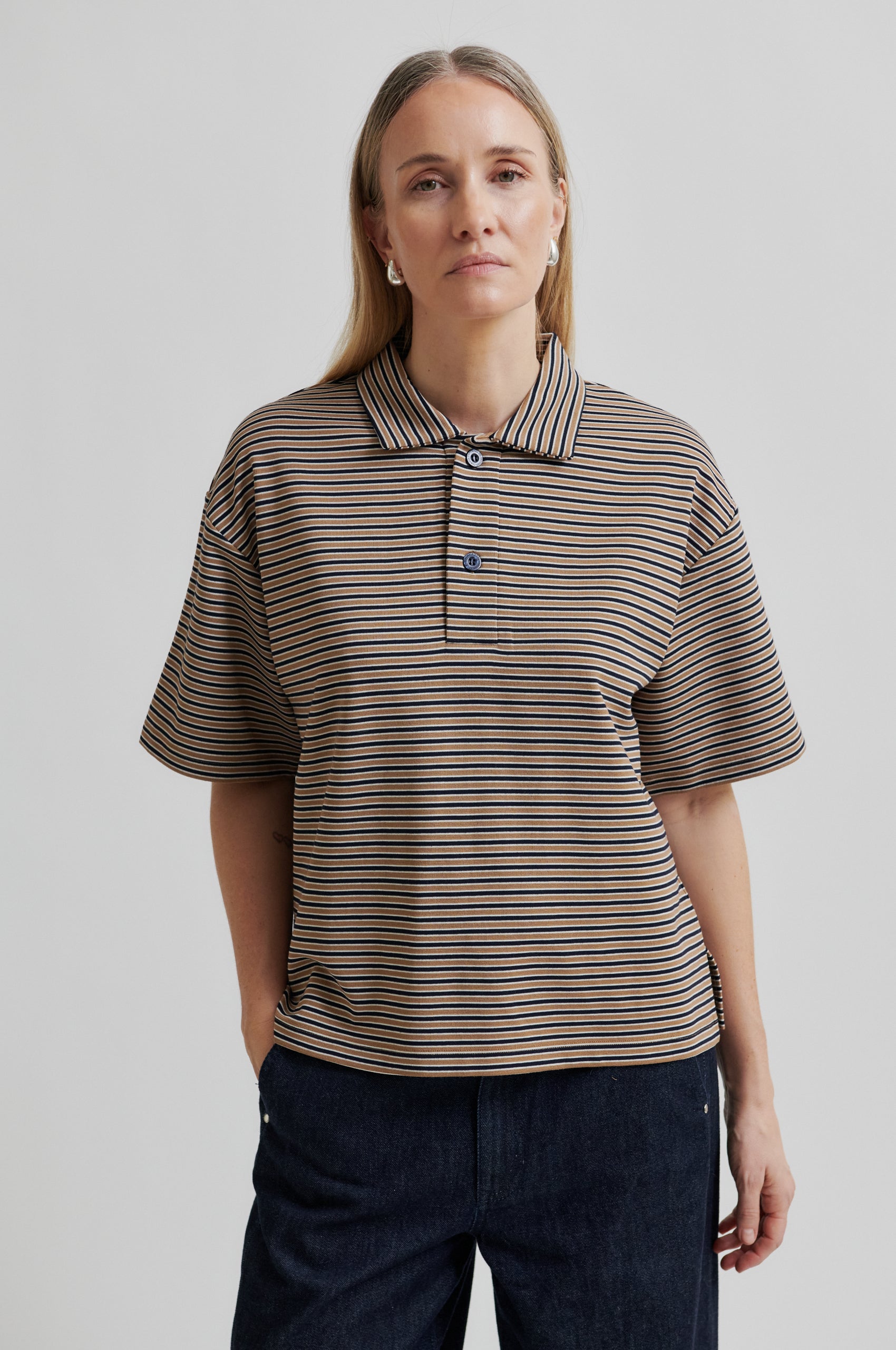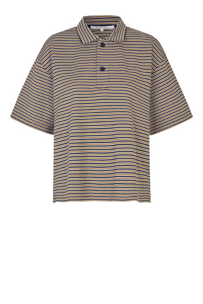 Fed polo fra Second Female i lysebrun. Poloen har smalle striber i sort og hvid. Snittet er boxy, så din stil kan blive helt afslappet. Style til brune shorts eller bukser, eller gør det helt enkelt med et par fede jeans.