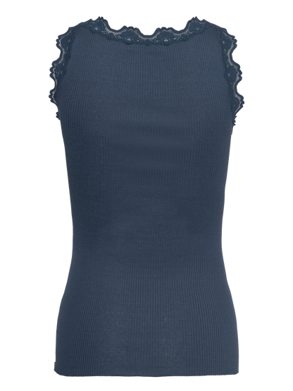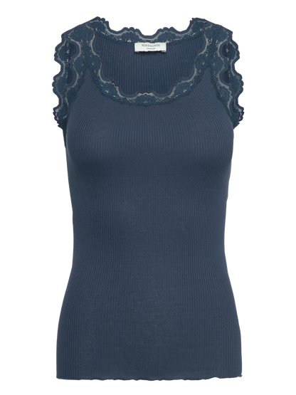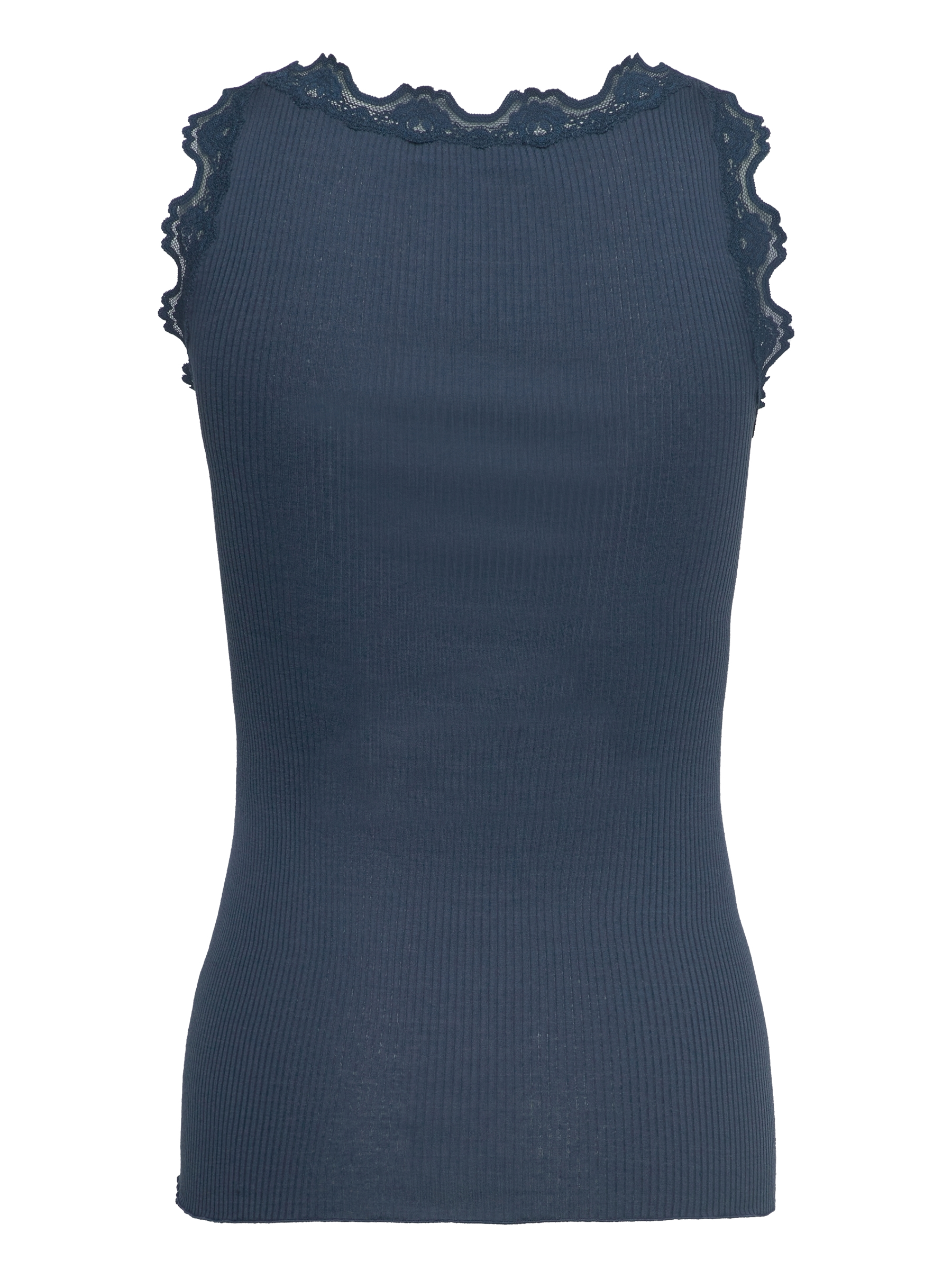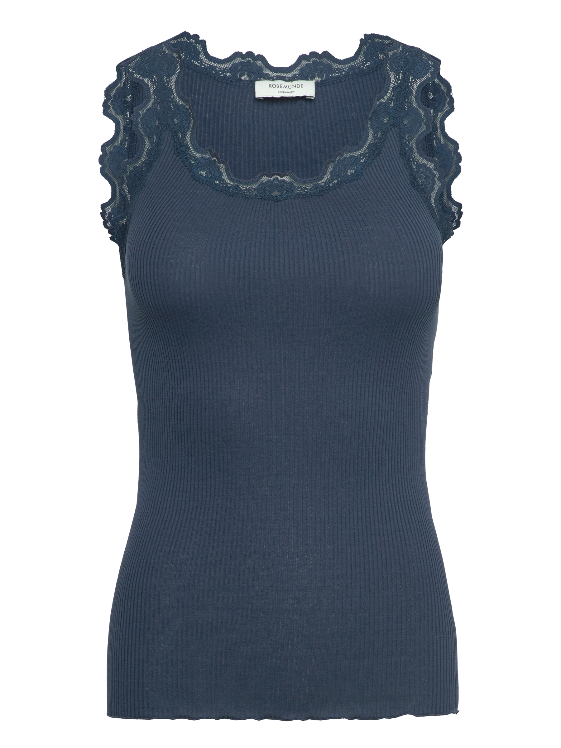 Flot petroleums farvet blondetop fra Rosemunde. Den lækre kombination af silke og bomuld gør toppen blød og elastisk at have på. Der er ingen generende sidesømme, så du kan virkelig føle dig godt tilpas i toppen. Blondekanten ses langs halsudskæring og ved ærmegab og er med til at give det feminine look. Perfekt at style til dine sorte bukser, så du får et elegant look. Den fine petroleumsfarve er også flot til brune eller grå bukser.