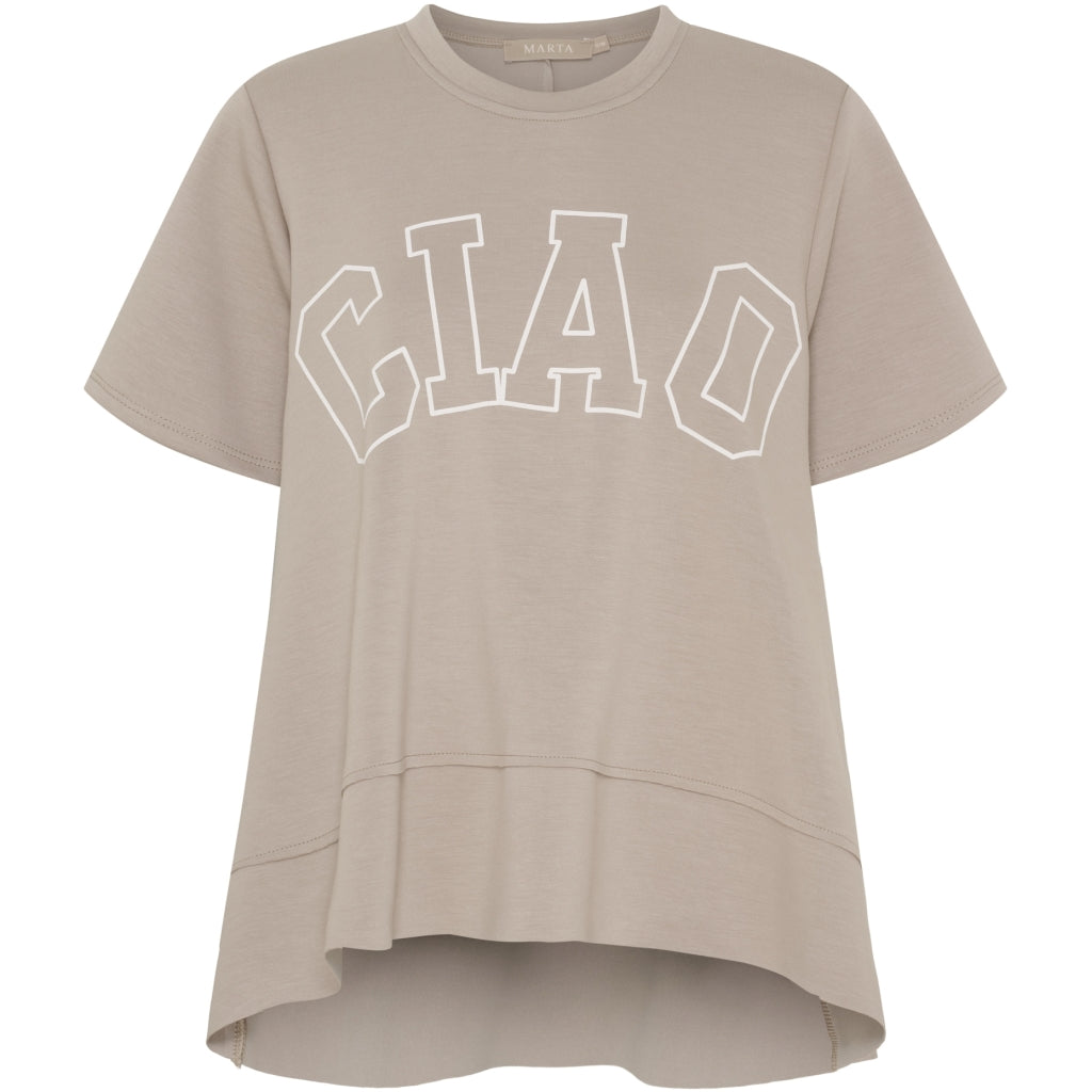 Flot sweat t-shirt fra Marta du Château i en lækker sandfarve. Foran står teksten CIAO skrevet med hvide bogstaver. Blusen har en bred kant nederst, der giver et virkelig flot fald. Style med de matchende bukser, så du får et helt sæt, som du ser det på Charlotte på billedet.