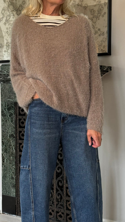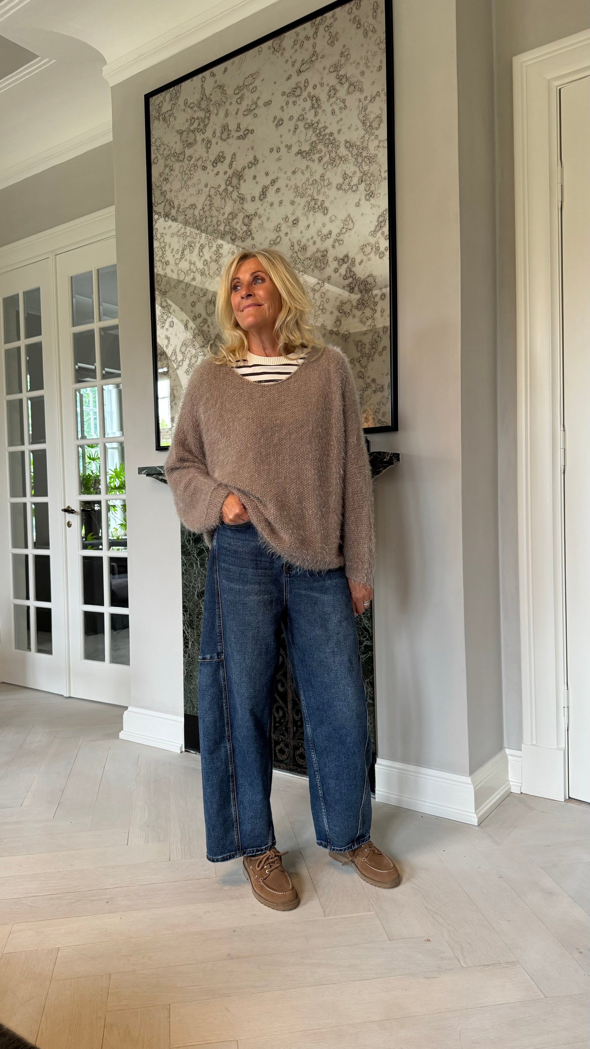 Den gode chenille strik fra Marta du Château er kommet i en flot, lysebrun farve. Strikken er uendelig blød og virkelig dejlig at have på. Style med den stribede Brooklyn t-shirt under og de nye Sayla bukser, hvis du vil have samme outfit, som du ser på billedet.