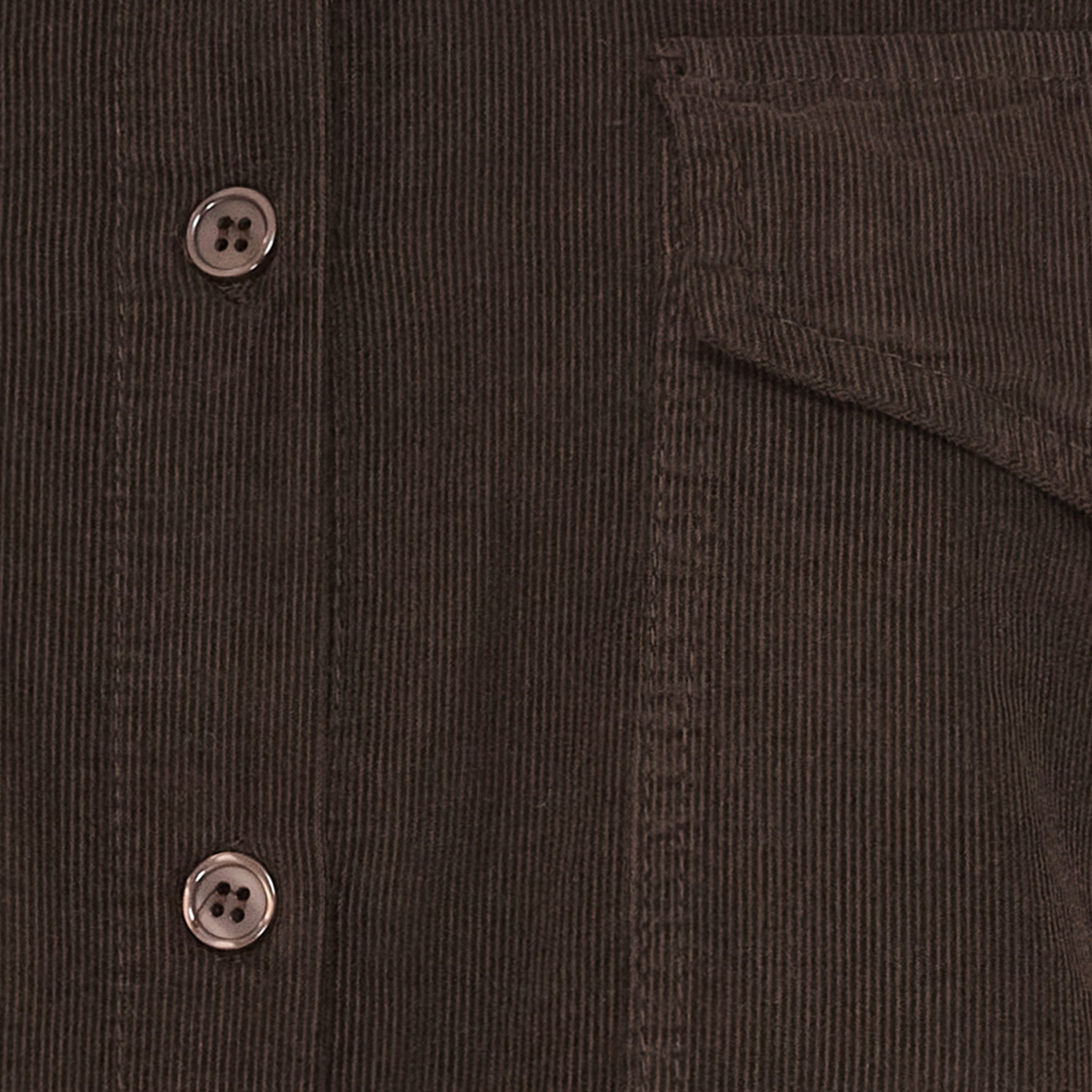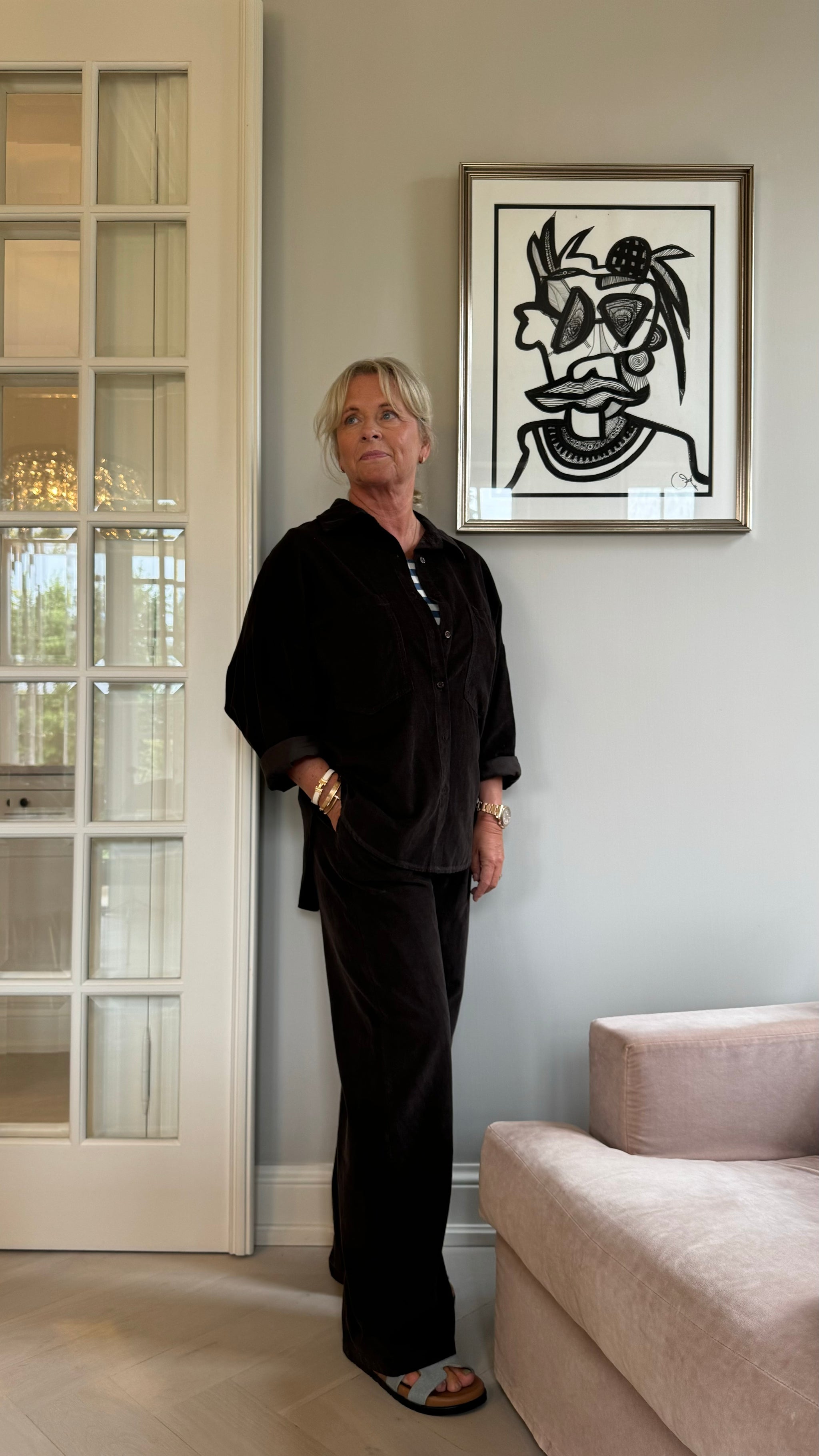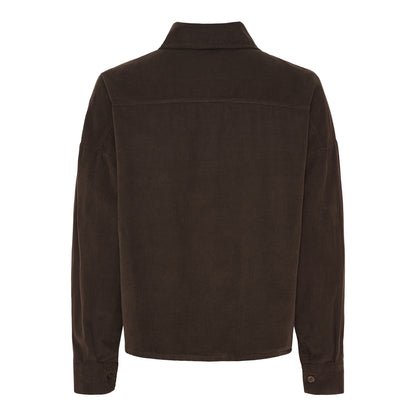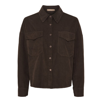 Super fin skjorte fra Marta du Château i mørkebrun babyfløjl. Skjorten har lommer på brystet og en cropped pasform. Du kan med fordel style som Charlotte på billedet, hvor du sætter de fine Kiana bukser til, som også er mørkebrun babyfløjl.