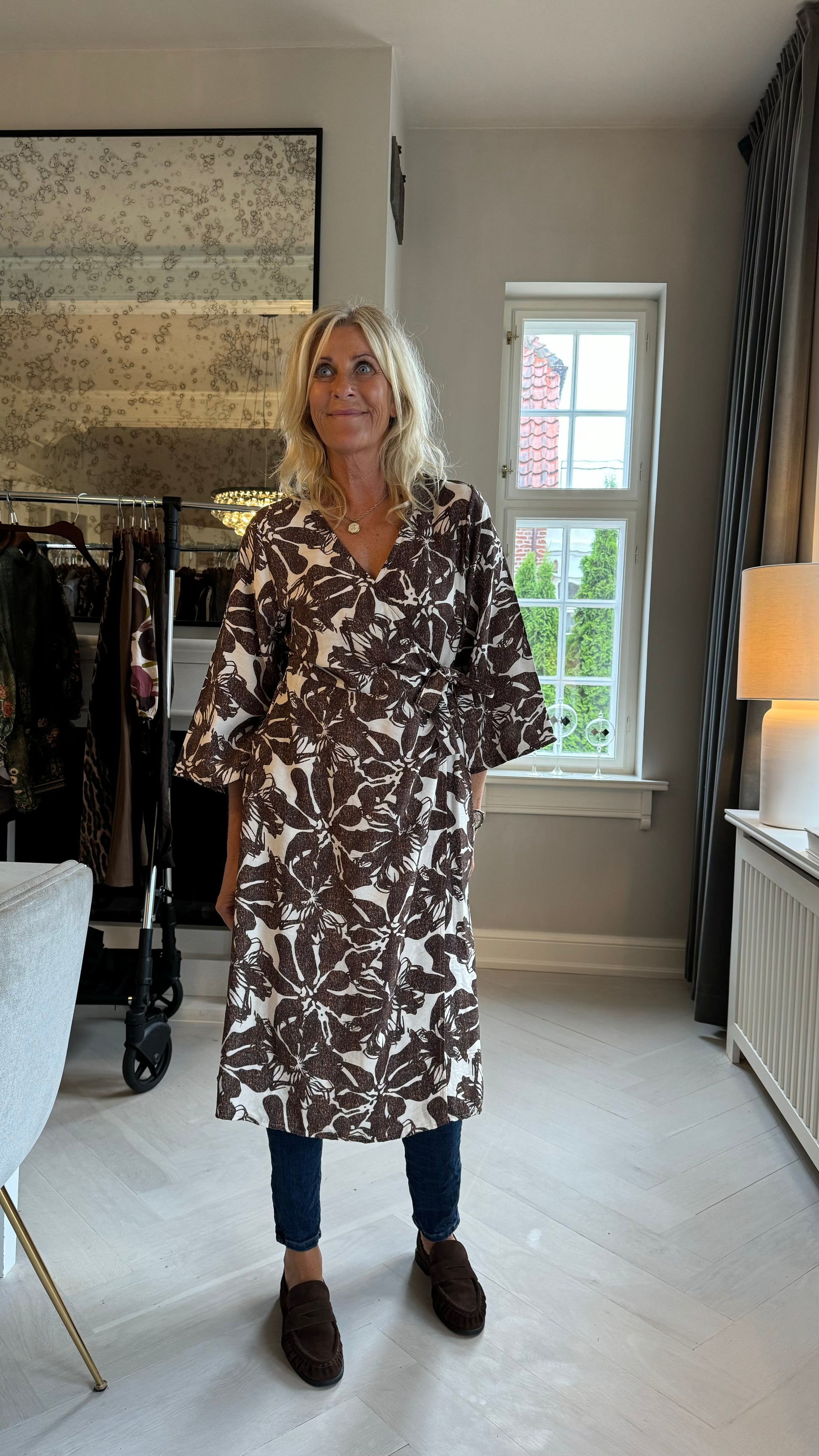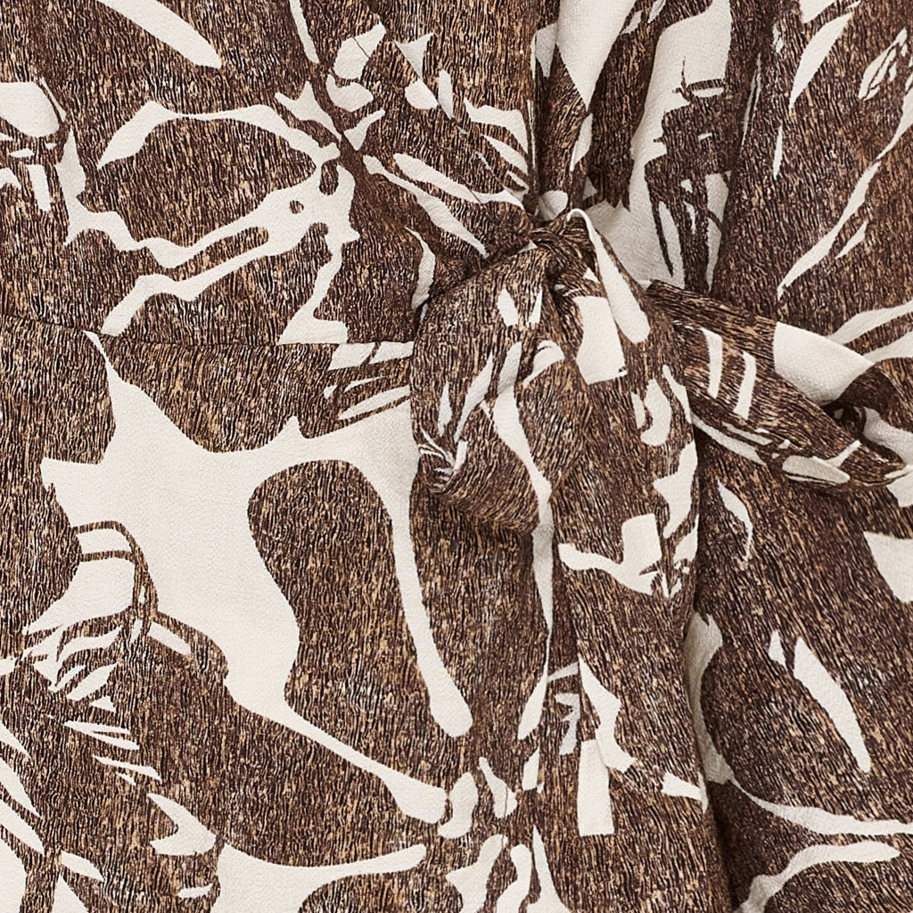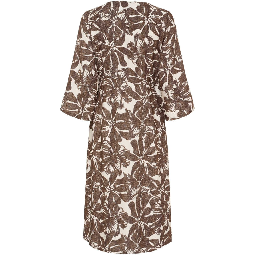 Lækker slå-om kjole fra Marta du Château i brunt og hvidt print. Kjolen har et feminint look og kan styles over et par skinny jeans, som du ser på billedet. Du kan også bruge kjolen som den er med sandaler til sommer og et par fede støvler til efteråret.