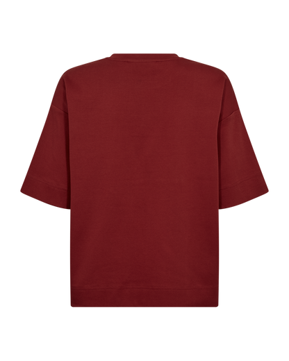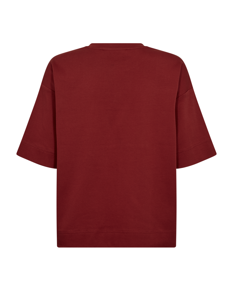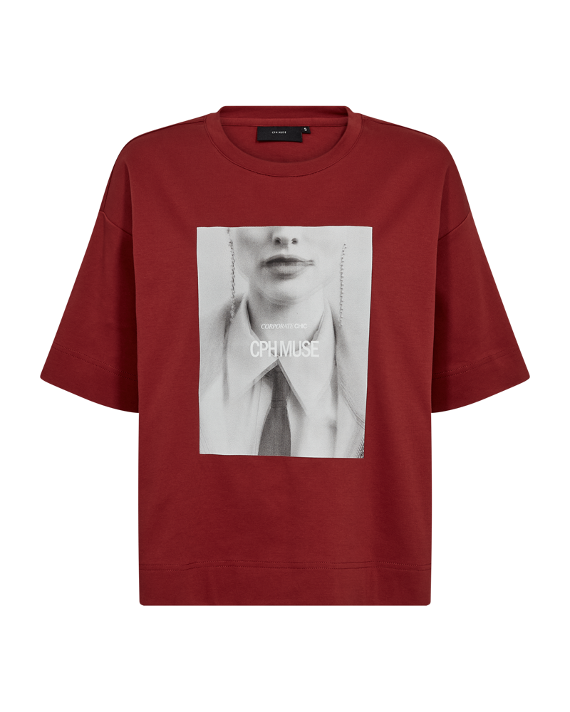 Boxy t-shirt fra Copenhagen Muse i en lækker vinrød farve. T-shirten er i kraftig kvalitet og har et cool sort/hvid print foran. Style til dine jeans eller de grå Tailor bukser.