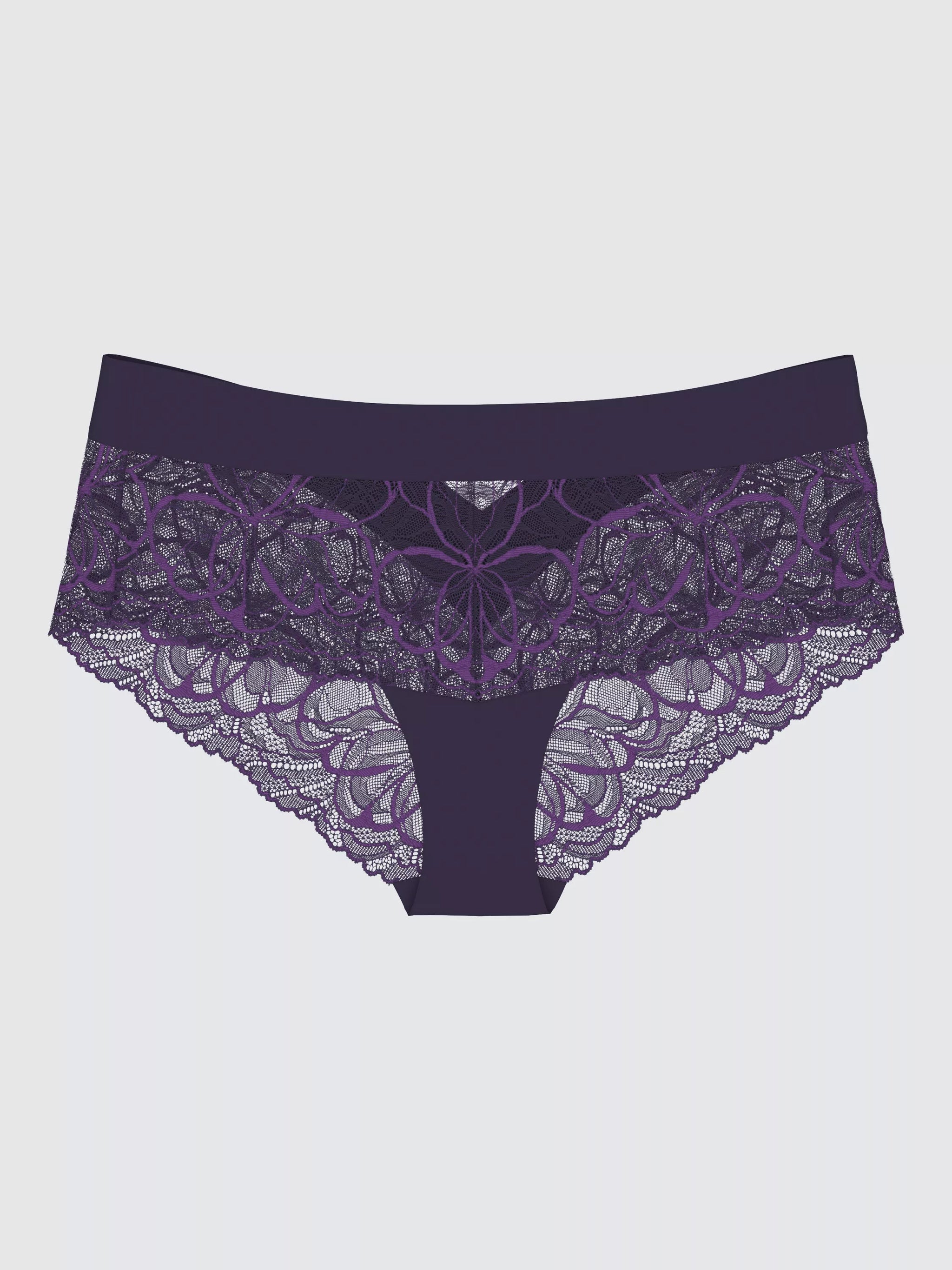 Elegant blonde hipster fra Triumph i en mørk, lilla farve. Hipsteren har de fineste blonder på forsiden og bagsiden og er afsluttet med en bred mikrofiber kant i linningen. Bagpå går linningen ned i en flot v-udskæring, så din bagdel syner mindre. Kombiner med den matchende Body Make-Up Illusion bh, så du får et helt sæt, der matcher.