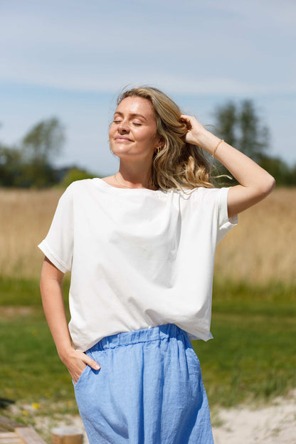Skøn bomulds t-shirt fra Black Colour med bådudskæring. T-shirten har en løs pasform og et lettere oversize look.