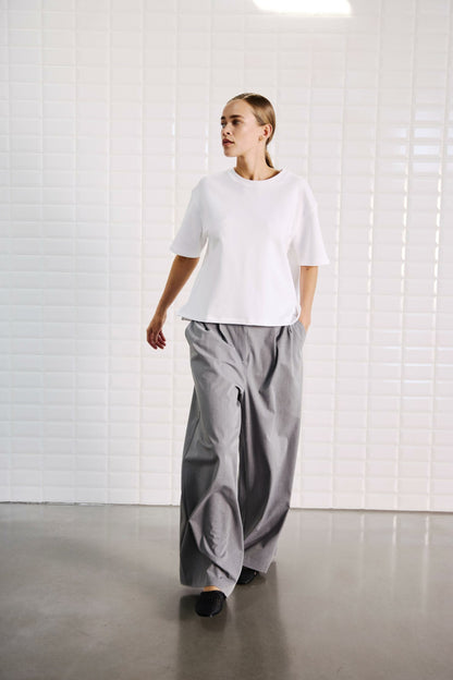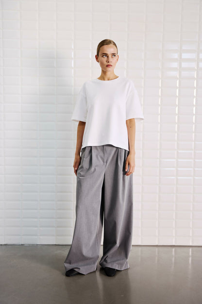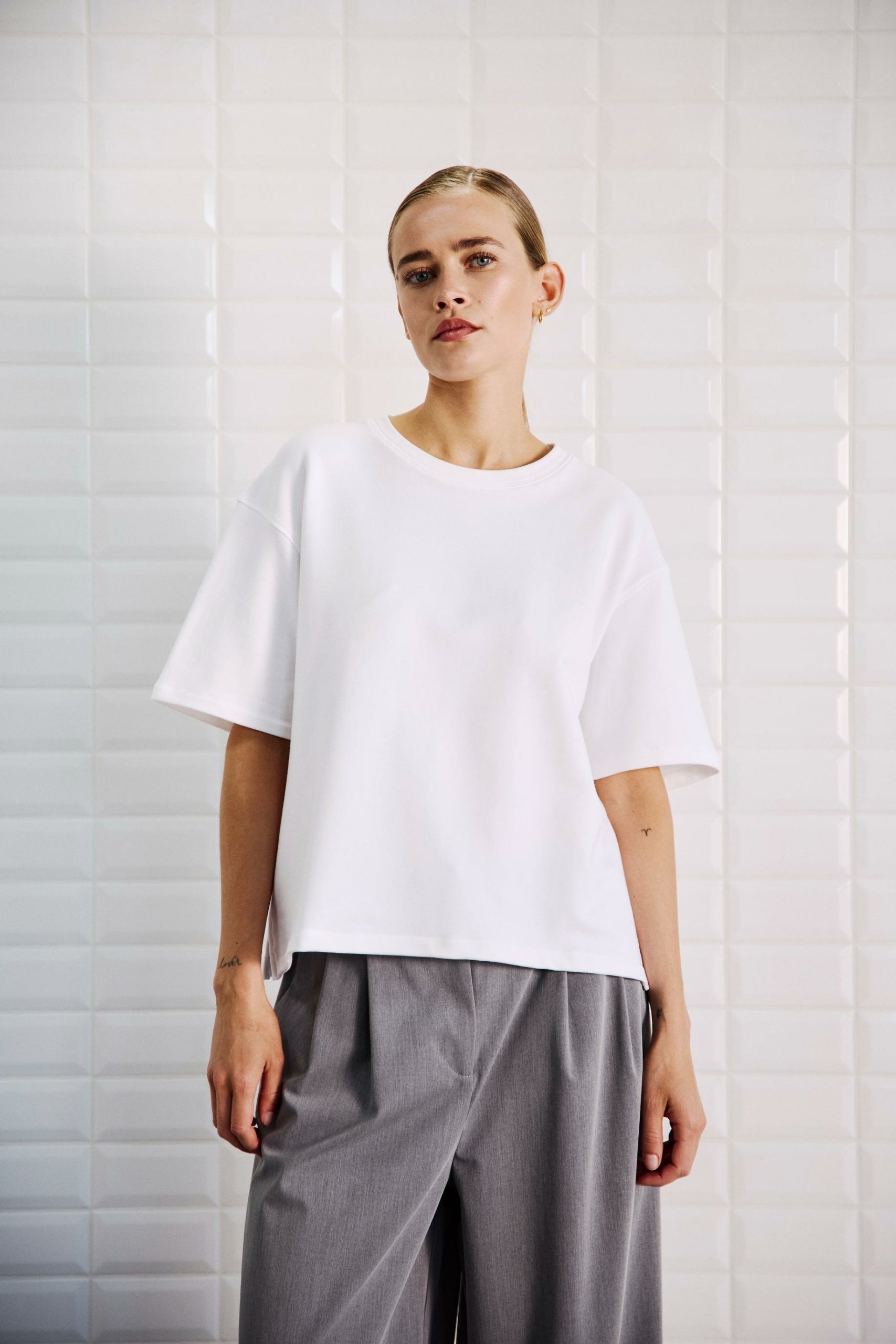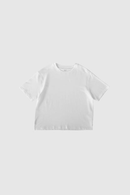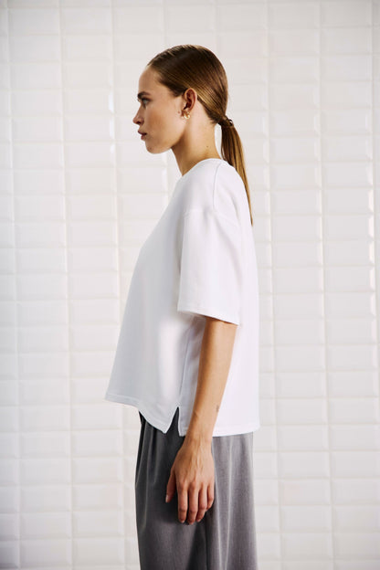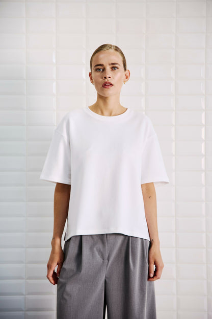 Boxy, hvid t-shirt fra WithBlack. Den kraftige bomuldskvalitet giver t-shirten en flot pasform. Der er små slidser i siderne og sænkede skuldre, så du får det flotte, oversize look, der er så eftertragtet. Style t-shirten til dine yndlingsbukser - gerne bukser med vidde i benene.