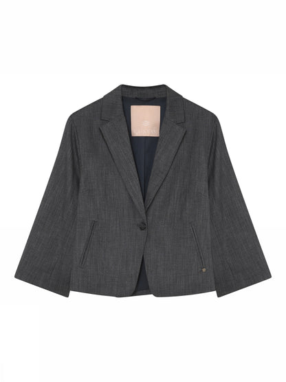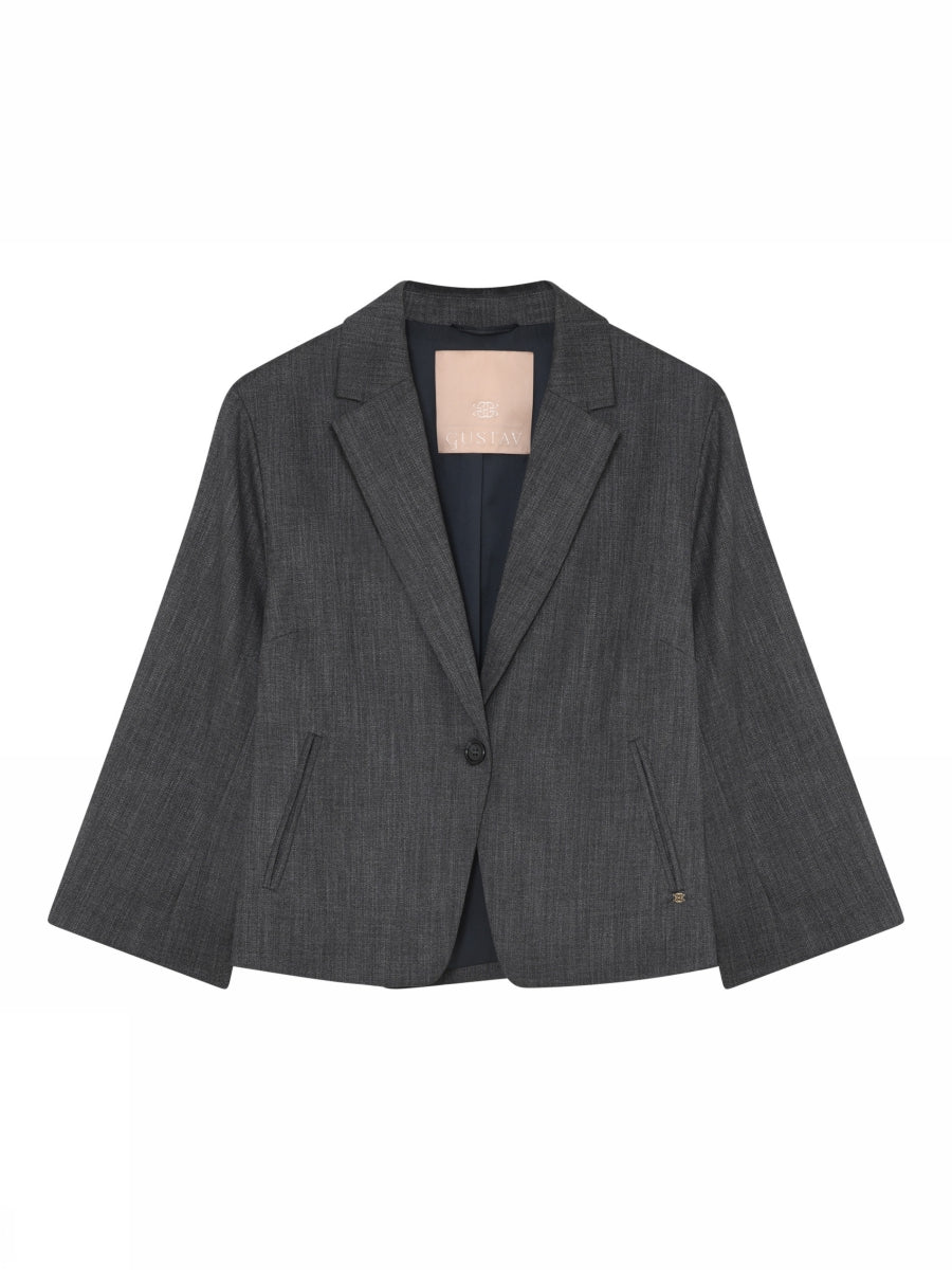 Kort Gustav blazer i en flot, mørkegrå melange. Blazeren har et boxy snit og lukkes med en enkelt knap. Den populære blazer blev hurtigt udsolgt i foråret, så du skal ikke vente for længe, hvis du skal sikre dig en til efteråret. Style til de matchende Bali bukser og skab et lækkert sæt. Blazeren er flot med en skjorte eller tynd strik under.