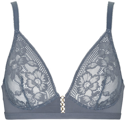 Den smukke Kaya bh fra Missya er en bralette uden bøjler eller vattering. De bløde skåle er lavet i transparent mesh med fine blomster. Skålene danner en dyb plunge, så du får en flot kavalergang. Sæt den matchende trusse til, så du får et helt sæt.
