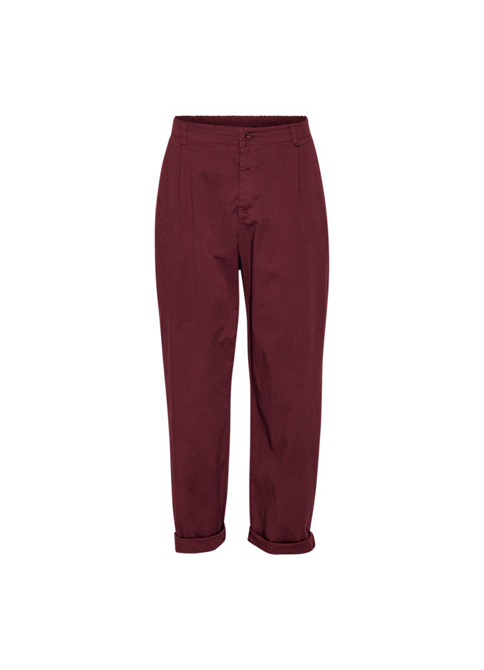 Lækre bukser fra Amaze Cph i bordeaux. Bukserne lukkes med knap og lynlås og har opsmøg ved benene.