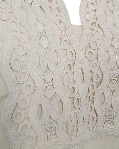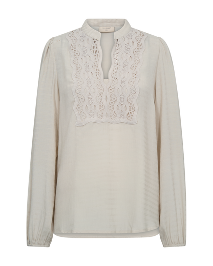 Elegant bluse fra Freequent i beige viskose. Blusen har et smukt broderie anglaise stykke foran, som giver den et feminint touch. Blusen er super fin til et par sorte bukser. Sætter du en sort stilet til, har du et lækkert outfit, hvis du skal ud at spise eller til middag hos vennerne.