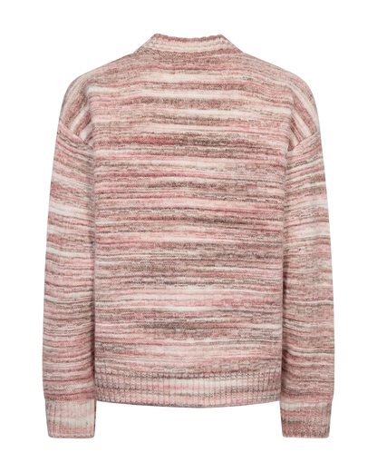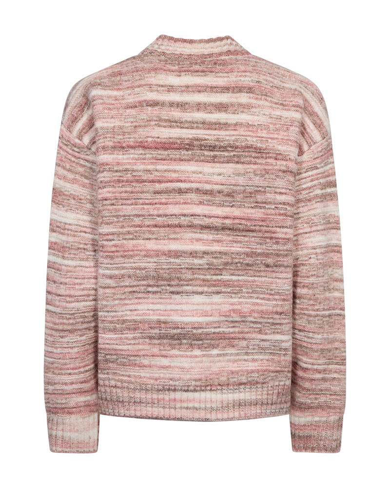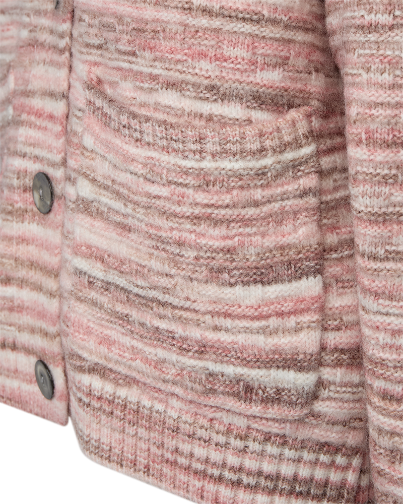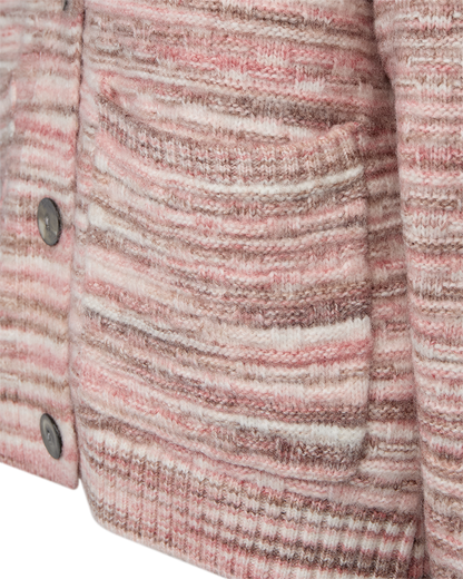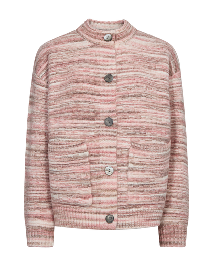 Lækker strik cardigan fra Freequent i rosa toner. De brune og beige farver danner et fint, stribet mønster, der laver en flot effekt. Cardiganen har store lommer foran og lukkes med store knapper. Perfekt til et par brune bukser, så du kan skabe et varmt efterårs outfit.