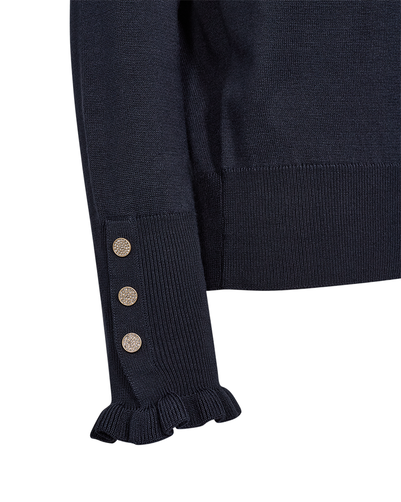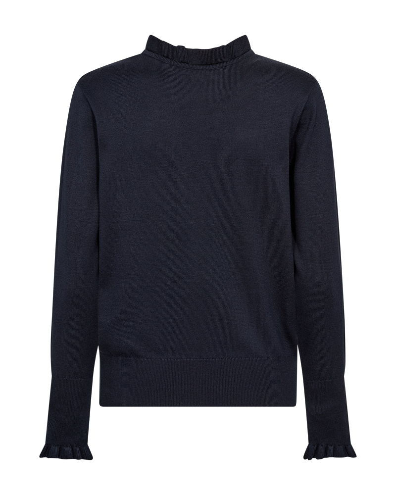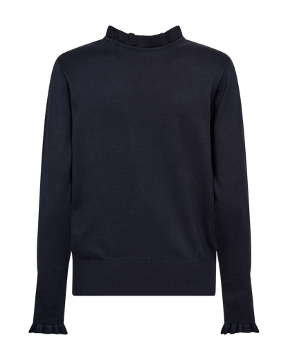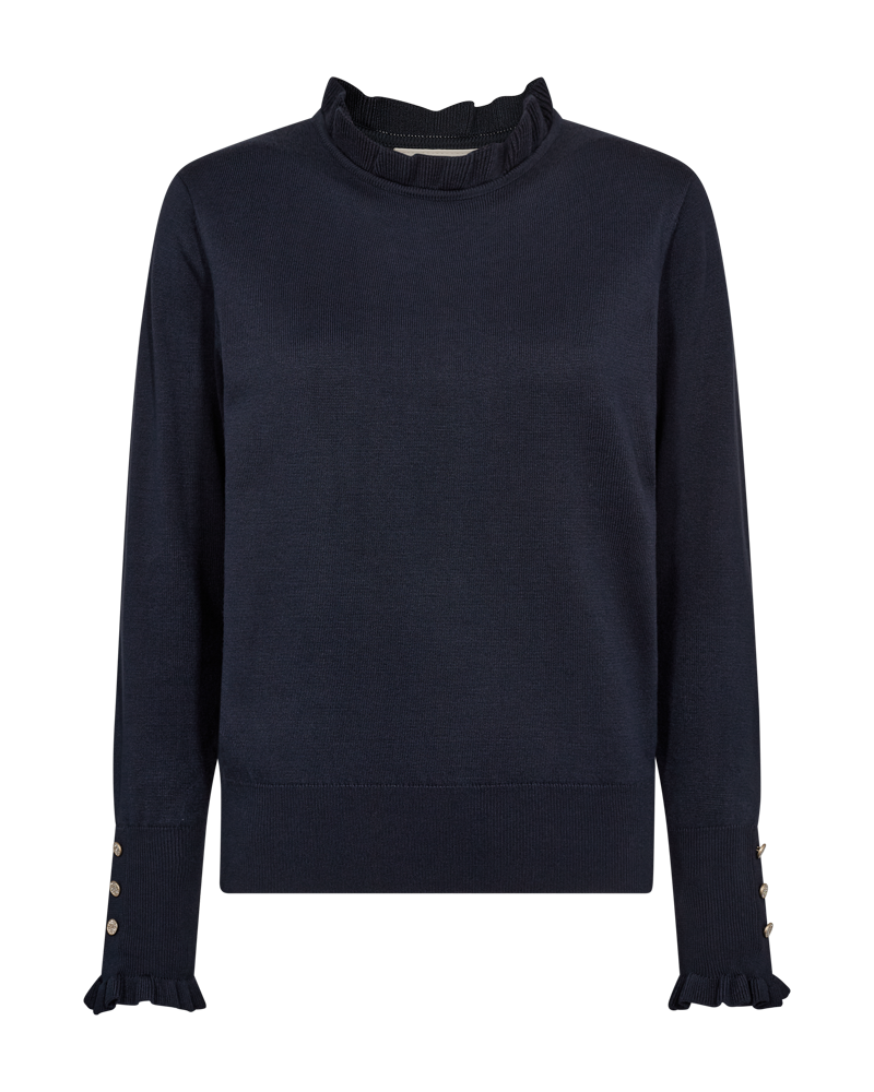 Feminin strikbluse fra Freequent i en lækker, mørkeblå farve. Strikken har søde flæsedetaljer ved halsudskæringen og ærmerne. Manchetterne er afsluttet med fine knapper.