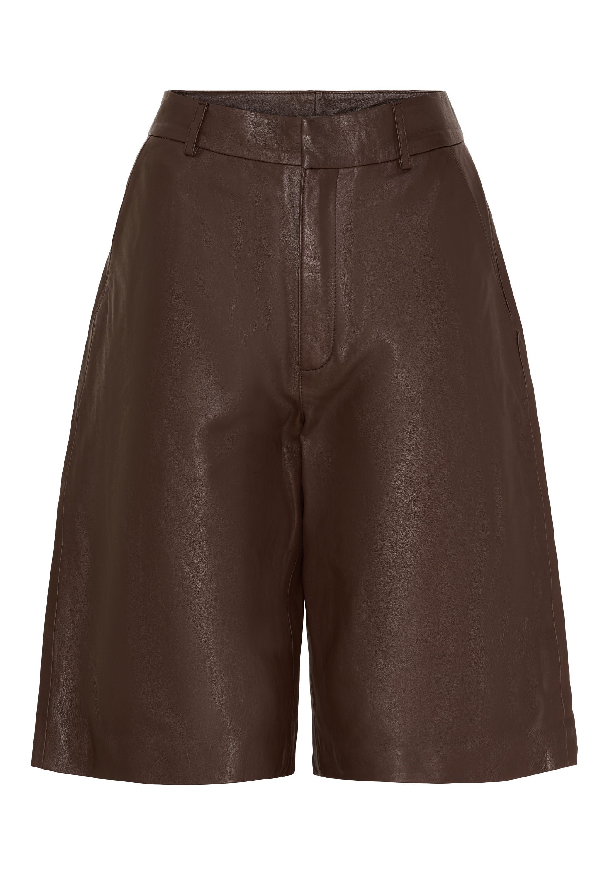 Bermuda shortsene er stadig et hit helt herhen i efteråret. Disse skindshorts kommer fra Notyz og er syet i det blødeste, mørkebrune lammeskind. De fede shorts lukkes med klassisk knap og lynlås i livet. De rå kanter ved buksebenene giver et let og casual look. Style med en fed strikbluse og et par høje støvler. Du kan også gøre dit look mere preppy med et par loafers og en polo.Mål:Str. 36: Taljevidde 78 cm - længde foran 29,5 cm.Str. 38: Taljevidde 82 cm - længde foran 30 cm.Str. 40: Taljevidde 86 cm - længde foran 31 cm.Str. 42: Taljevidde 90 cm - længde foran 32 cm.