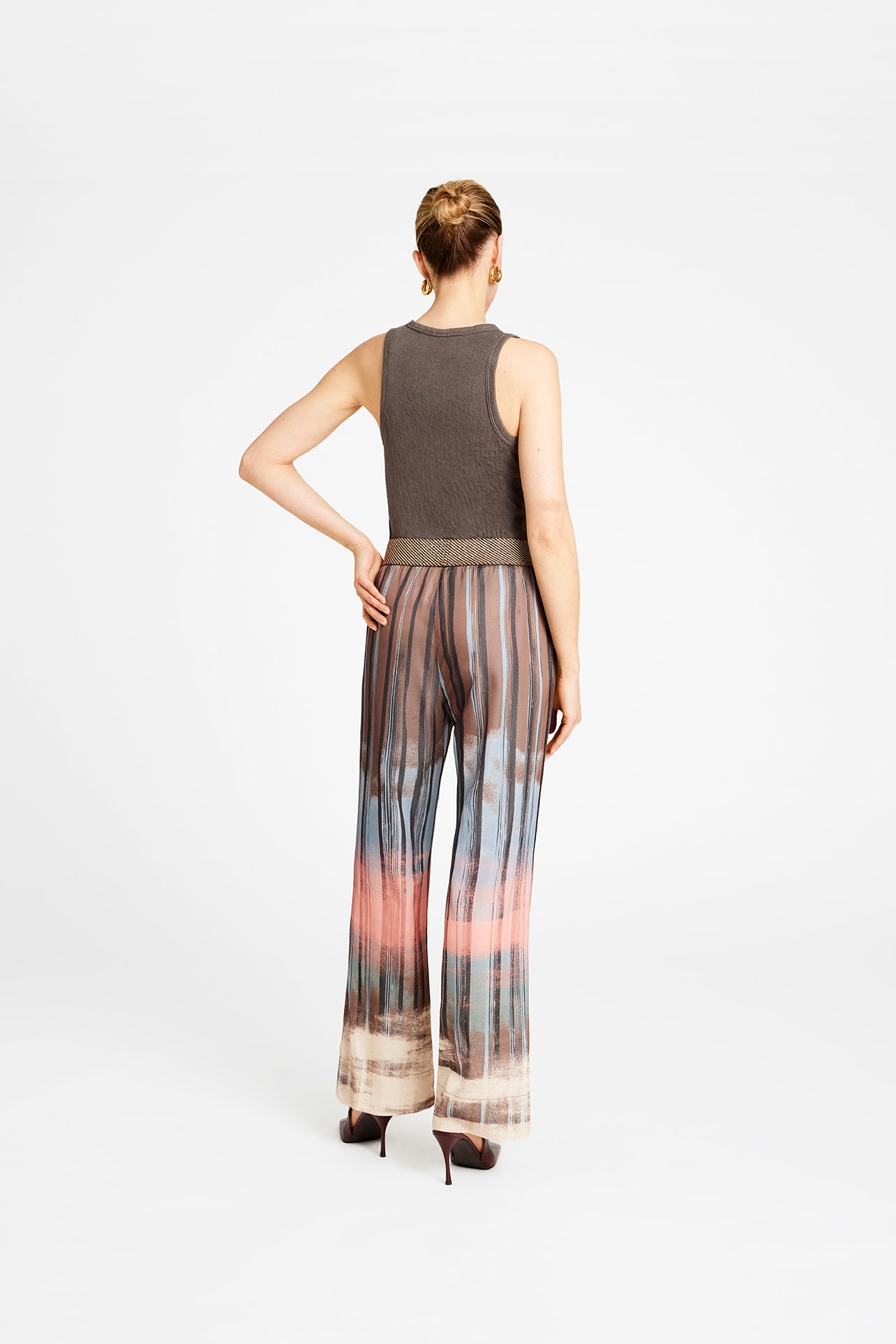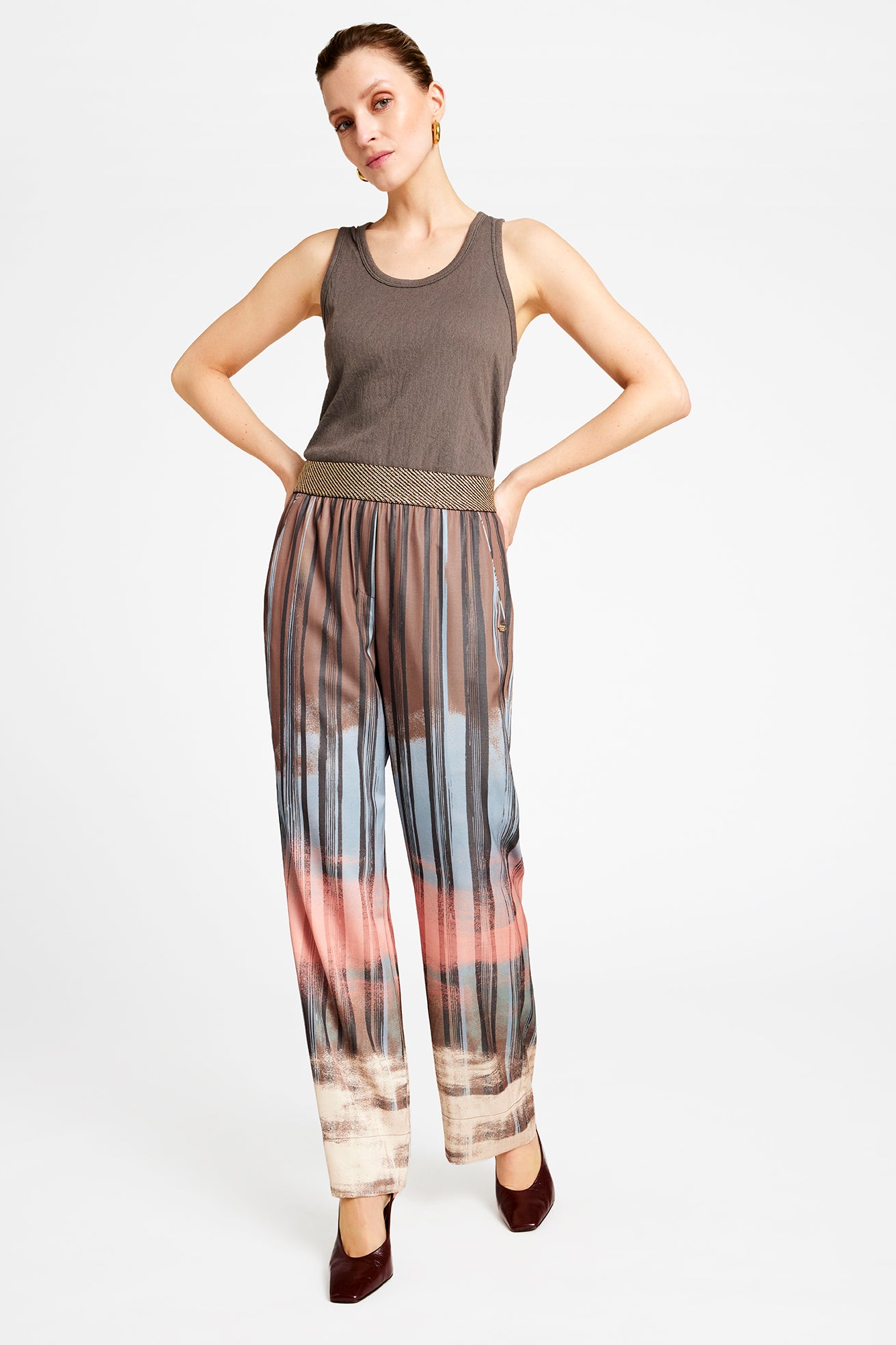 De fine Bay bukser fra Gustav er kommet i en lækker brun farve, der smelter flot sammen med rosa og beige, så du får et skønt batik look her til efteråret. Bay buksen har elastik i linningen og skrålommer i siderne. Perfekt at style med den fine Annsofie bluse i samme print, så du får et helt sæt. Hvis du gerne vil have lidt variation, er busken også fin med den lyse Coya strikbluse.
