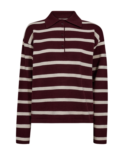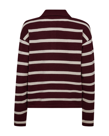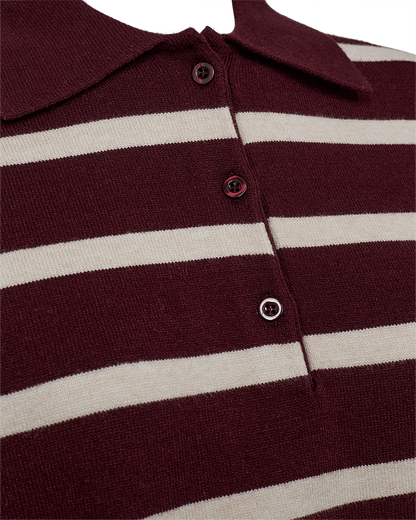 Du kommer ikke uden om de preppy poloer denne sæson. Her får du en strikket polo i bordeaux og off white striber. Poloen har klassisk krave og knappes med tre knapper. Style til din korte nederdel eller til et par shorts med en fin strømpebuks under. Så har du et lækkert efterårsoutfit.