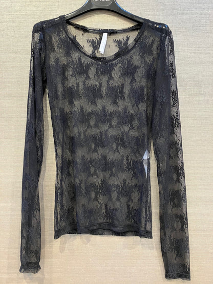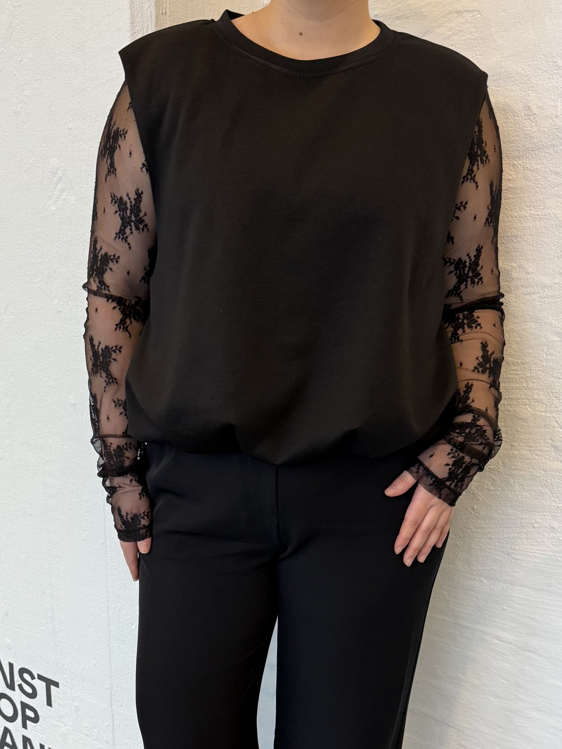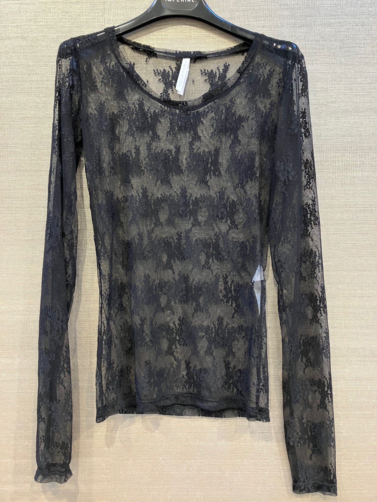 Elegant blondebluse fra Imperial i sort. Blusen er transparent og er derfor oplagt at bruge under din blazer eller en strik kappe. Det er super fint at lade ærmerne titte frem. Du finder også blondeblusen i off white. På billedet er blondeblusen stylet under den flotte vandfaldsbluse fra Imperial.