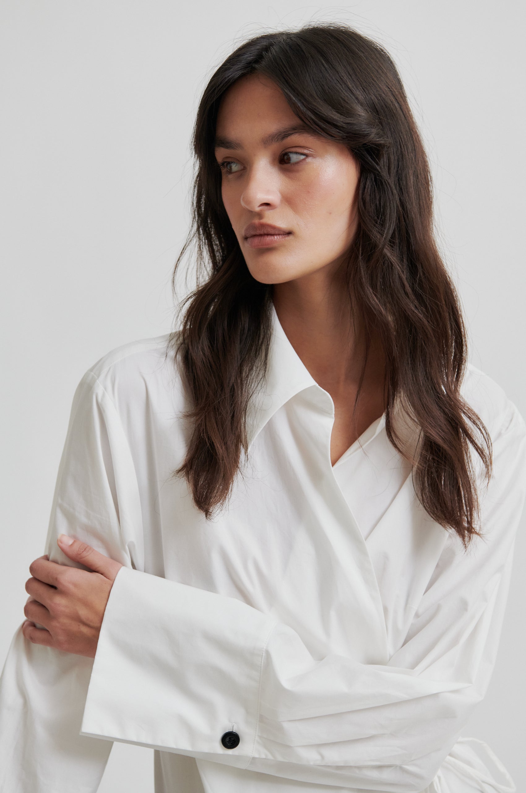 Flot, asymmetrisk skjorte fra Second Female i hvid bomuld. Skjorten har en elegant bindeløsning i venstre side, så du får et slå-om look. Manchetterne er høje og stive og lukkes med en enkelt, sort knap. Den perfekte skjorte til dig, der godt kan lide de stramme snit. Style til et par sorte bukser, eller blød looket op med tweed bukser.