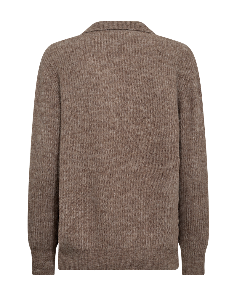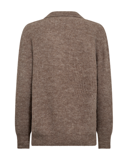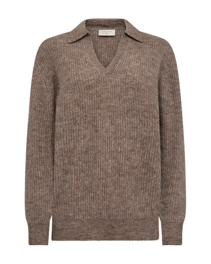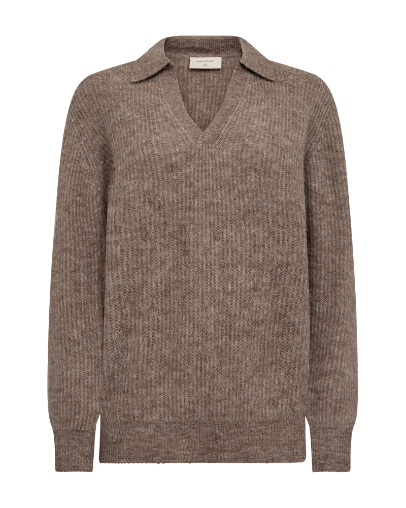 Lækker strikbluse fra Freequent i en flot, lysebrun farve. Blusen har fin krave og en flot pasform. Super fin til mørkebrune bukser.