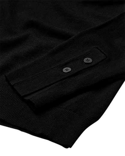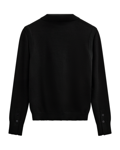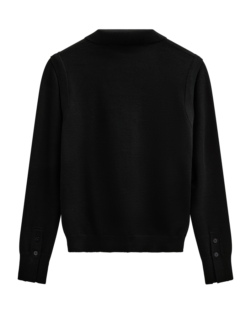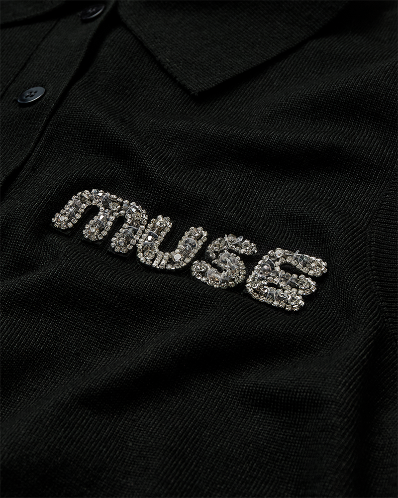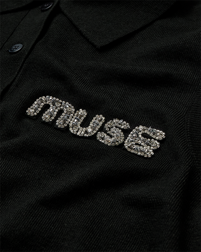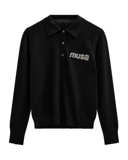 Elegant polo fra Copenhagen Muse i finstrikket viskoseblanding. Foran er "Muse" broderet med similisten, og giver strik poloen et elegant touch. Poloen har lille krave og lukkes med knapper. Flot at style til dine sorte bukser eller jeans. Der er knapper på manchetterne som er lavet med fin slids.