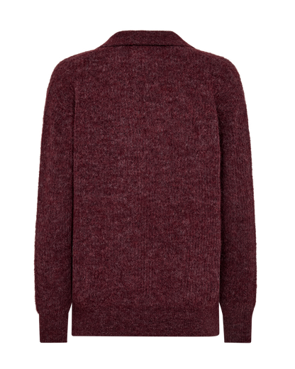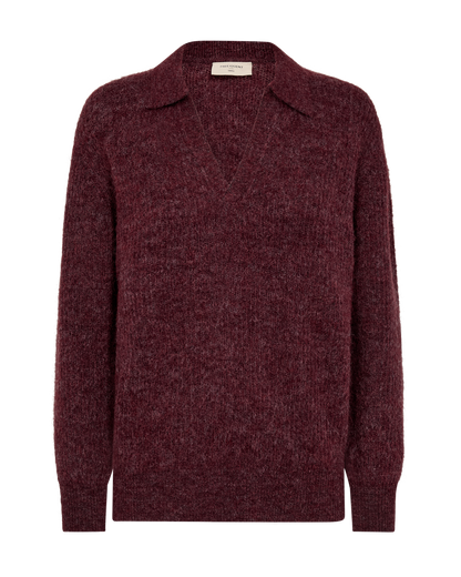 Lækker strikbluse fra Freequent med krave og v-udskæring. Den bordeaux farve er helt perfekt her til efteråret og kan styles til grå bukser, hvis du er med på den farvetrend.