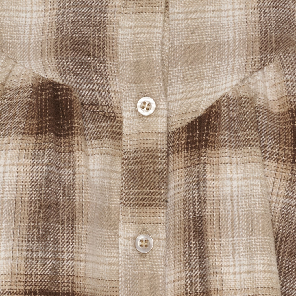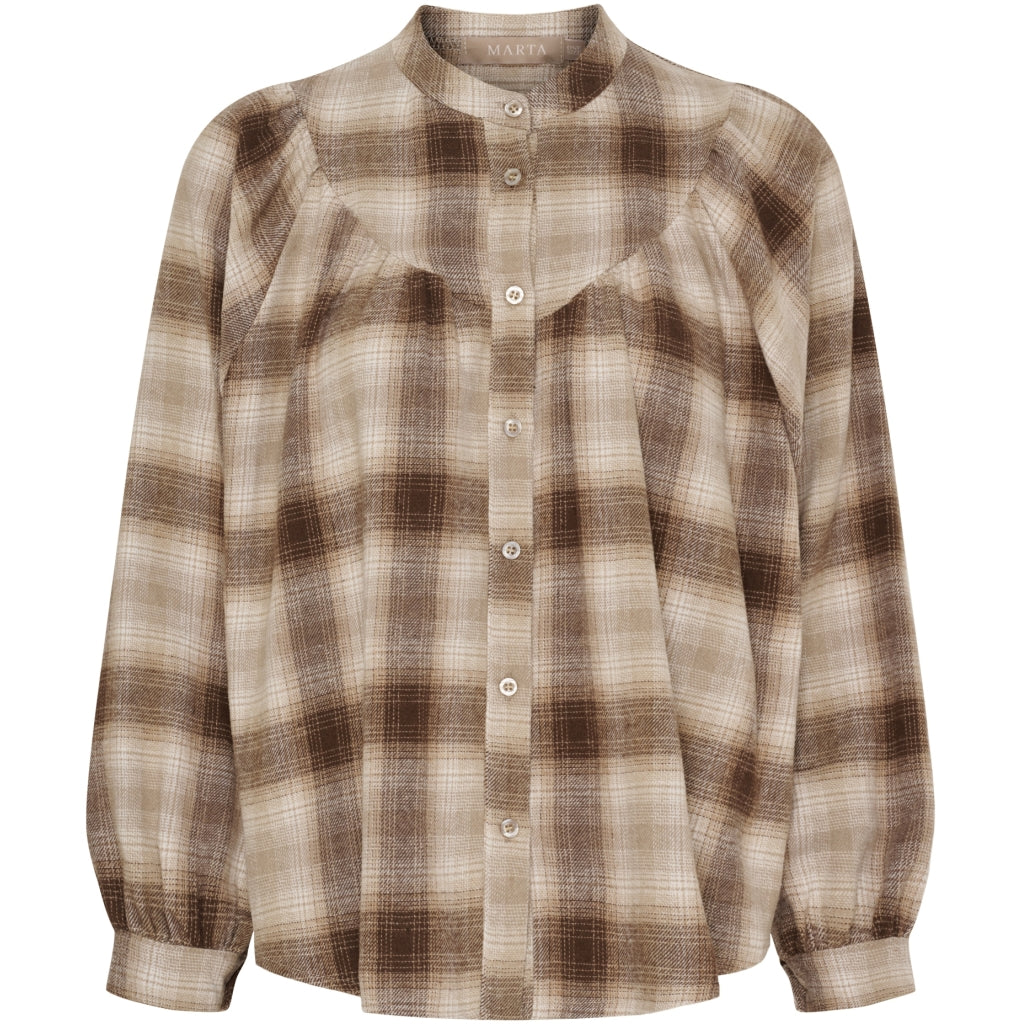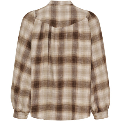 Skøn skovmandsskjorte i beige og brun. Skjorten har et feminint snit og er fin til et par brune eller sandfarvede bukser.