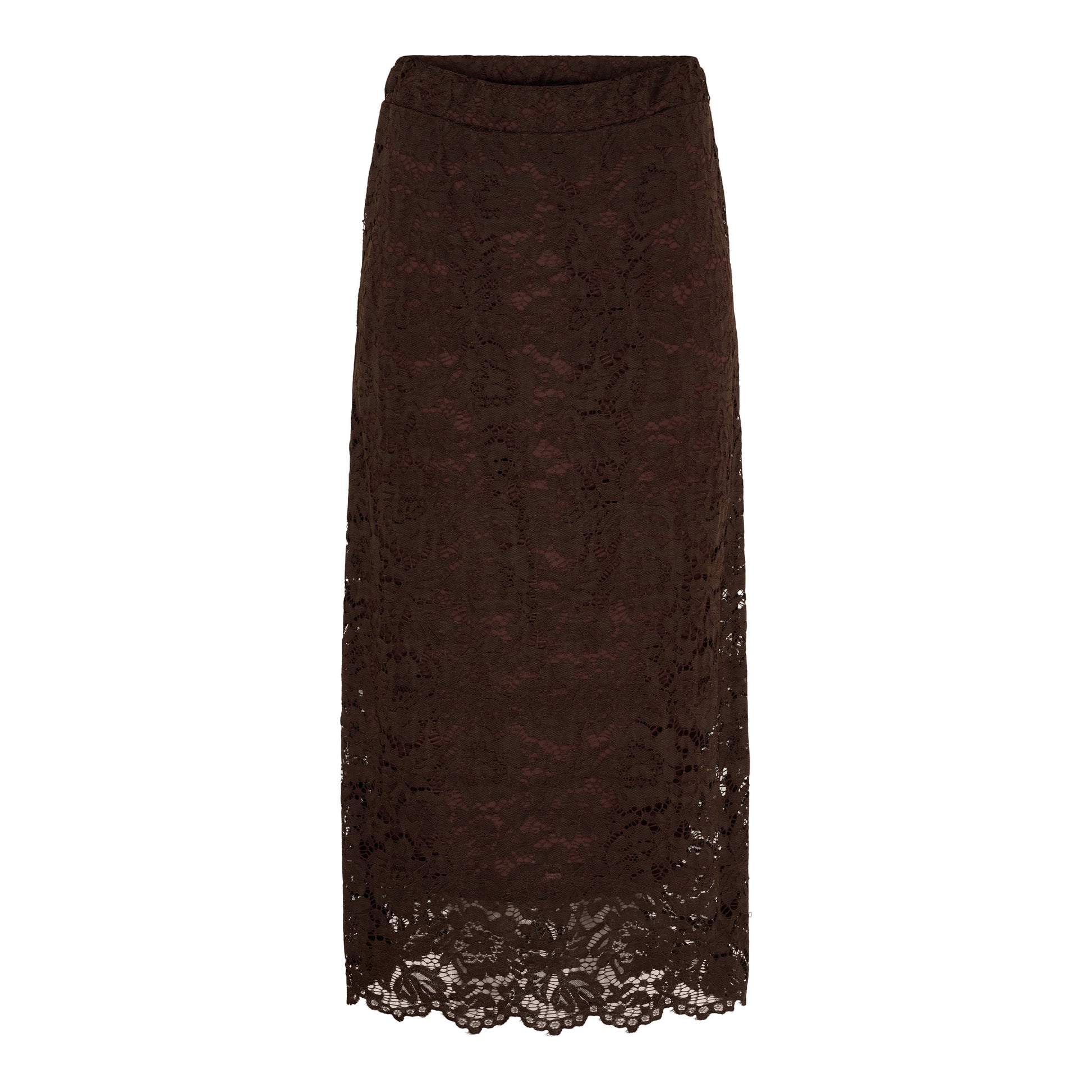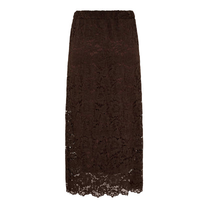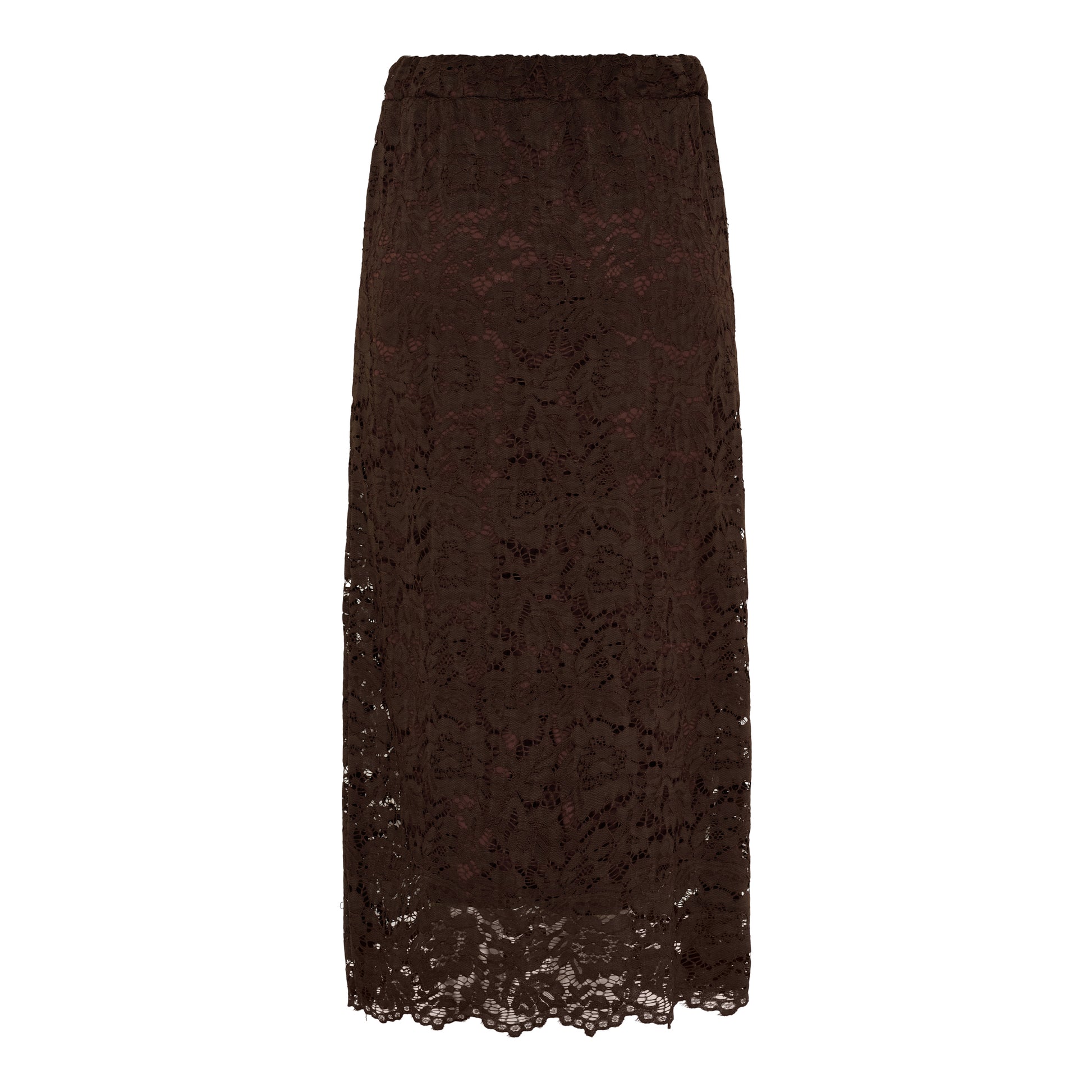Super fin blondenederdel fra Marta du Château i mørkebrun. Nederdelen har elastik i linningen, så du føler dig ekstra godt tilpas. Style med en chunky strik og fede støvler og leg lidt med kontrasterne i materialerne. Du finder også blondenederdelen i sort.