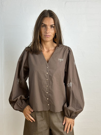 Fed skjorte fra Gaspar i brun bomuld. Skjorten er prydet med de smukke guldsmede, der kendetegner Gaspar. De fine ballonærmer og det firkantede snit sikrer det fede efterårslook.Mål:Bryst: s/m: 50,5 cmBryst:L/xl: 54 cm