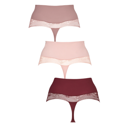 Skøn string 3-pak fra Missya i bordeaux toner. Denne trusse er høj og har lidt shape i sig, så den holder ind på maven. Samtidigt med at du får alt det gode en string trusse kan byde på. I denne 3 pak får du en bordeaux, rosa og lyngfarvet trusse for kun 199,95.OBS: Trusserne kan være svære at få over hofterne, men når de kommer på, er de størrelsessvarende. De kan dog virke små, når du tager dem på - det oplever man ofte med trusser, hvor der er shape i materialet.