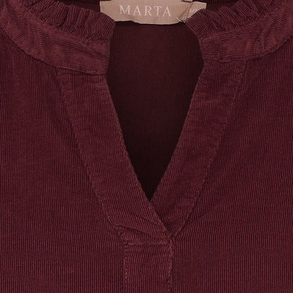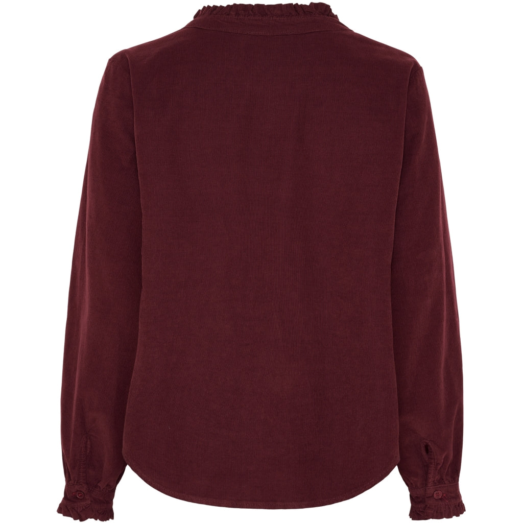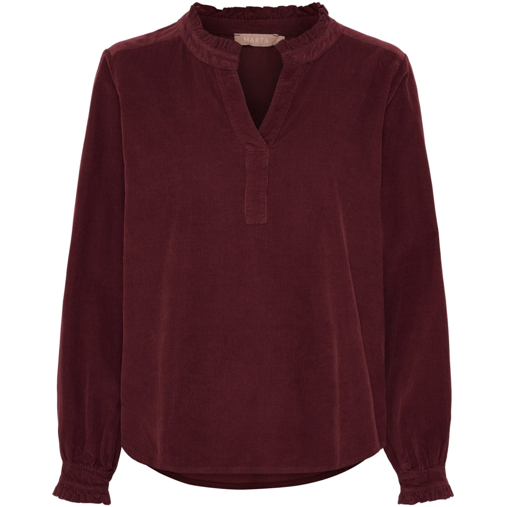 Fed bluse fra Marta du Château i bordeaux baby fløjl. Blusen har en fin v-udskæring og kinakrave. Det giver et enkelt men stadig feminint look.