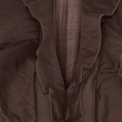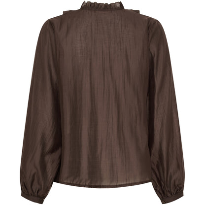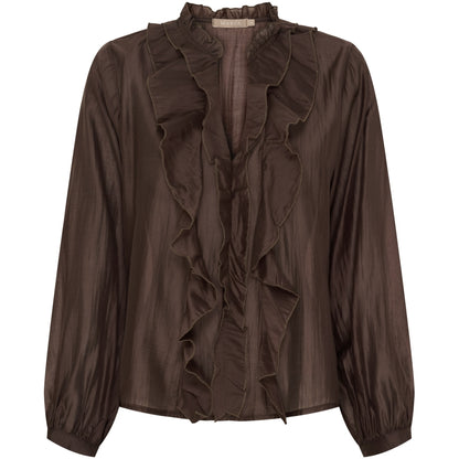 Elegant, mørkebrun bluse fra Marta du Château med fine flæser ned langs forsiden. Materialet er lettere transparent, så du får et let og fint look. Style til sorte bukser eller en nederdel.