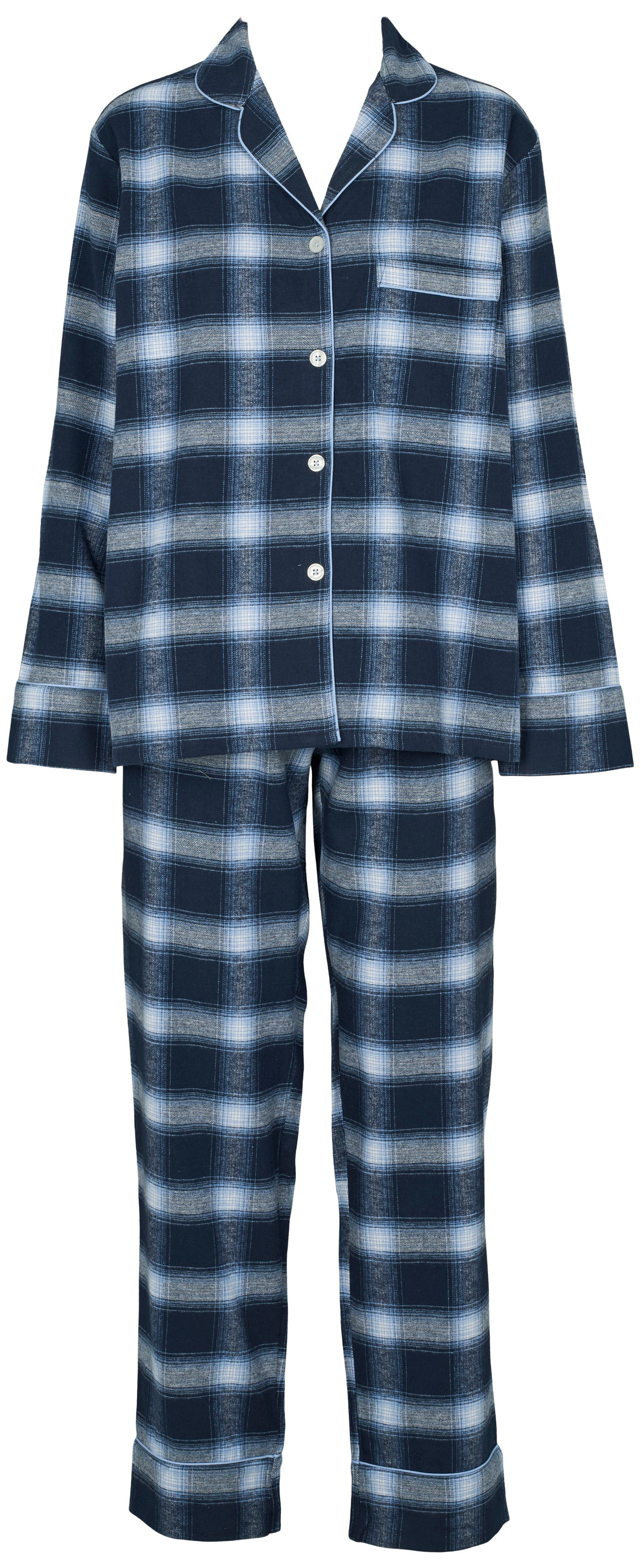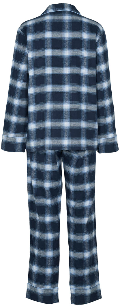 Lækker flonel pyjamas fra Missya i blå tern. Pyjamassen består af et bare bukser med lige ben og god vidde, hvor der er elastik i taljen. Dertil en pyjamasskjorte med fin revers og snydelomme på brystet. Du kan også sætte en hvid t-shirt til bukserne, hvis det bliver for varmt med skjorten til.