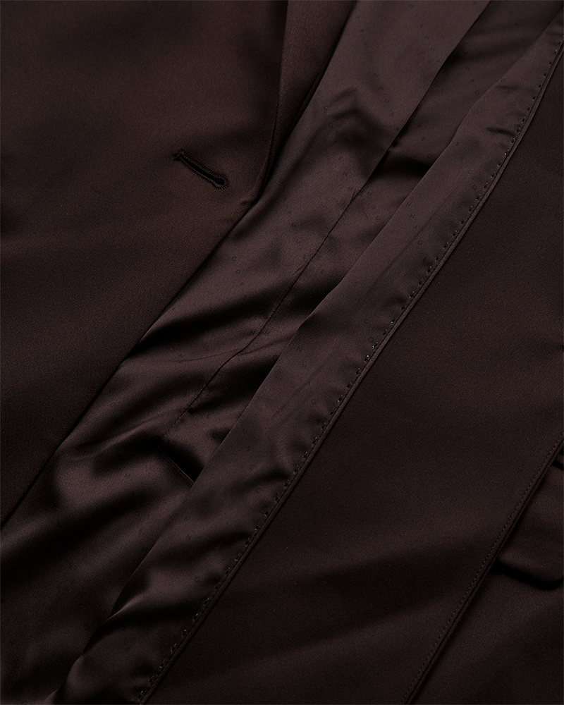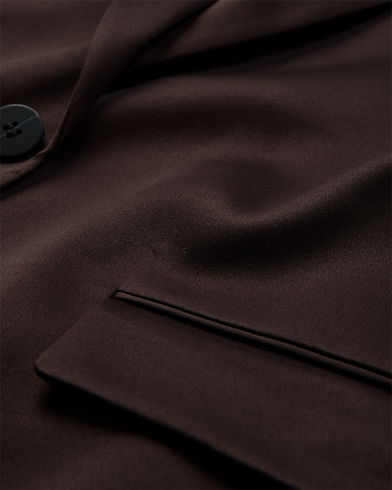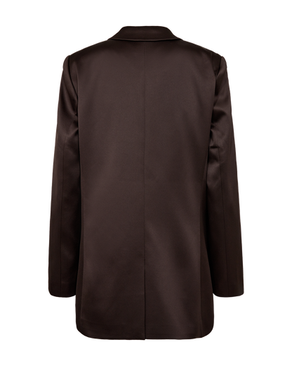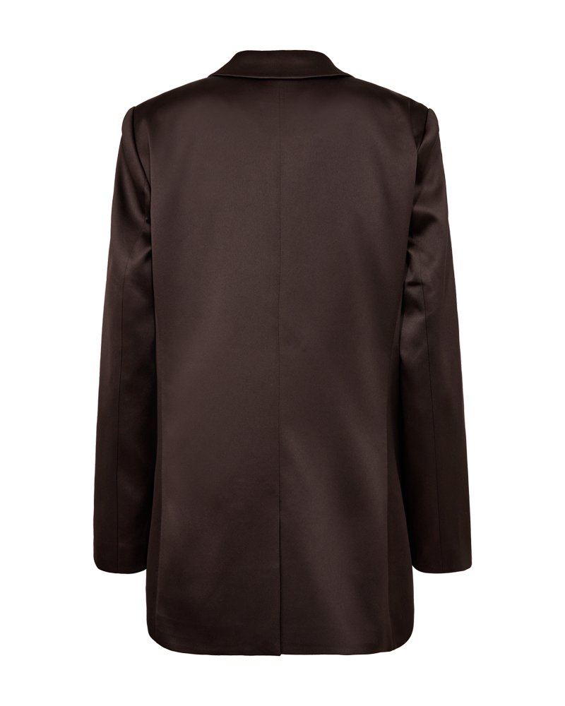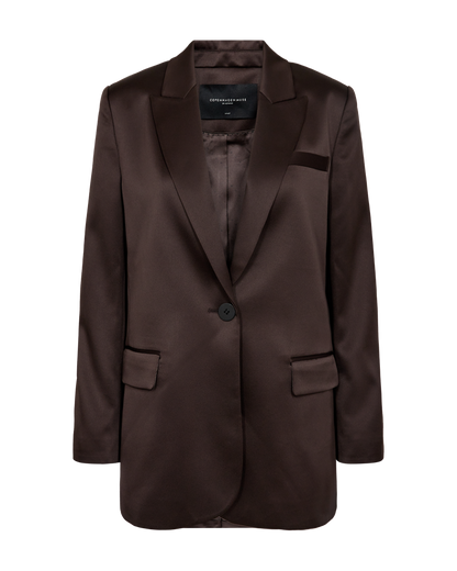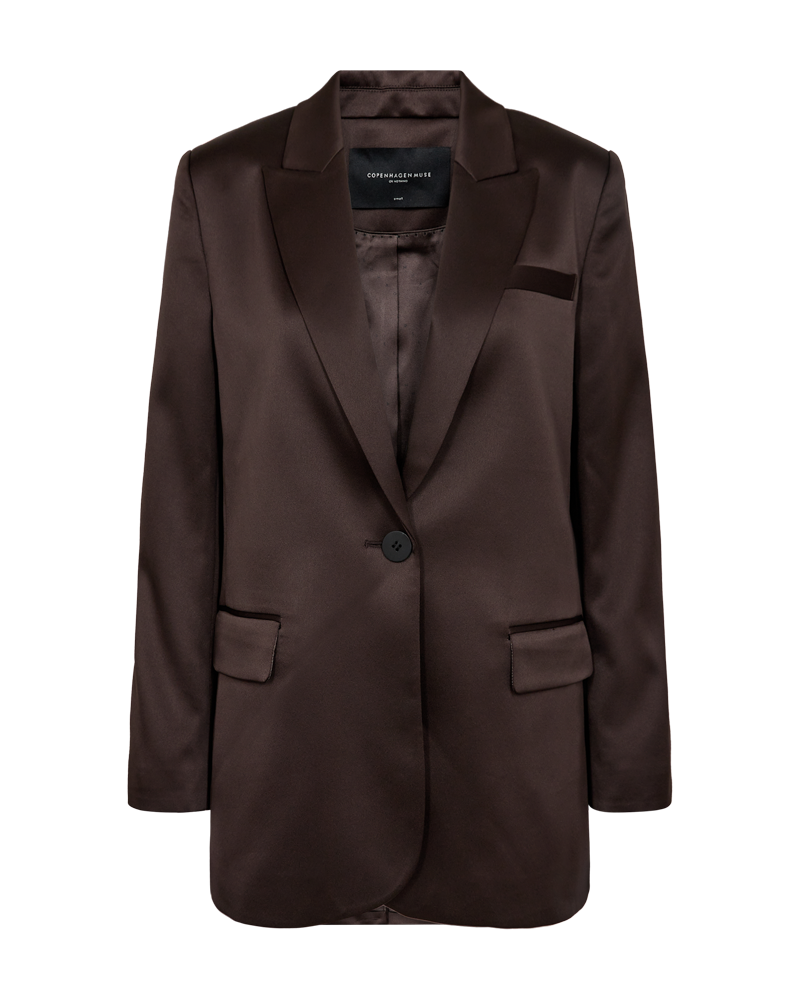 Lækker Copenhagen Muse blazer i fed satin. Den brune blazer har masser af shine og et oversize look. Style til de matchende Shine bukser så du får et lækkert efterårs suit.