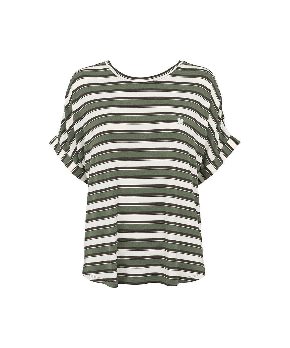 Sød t-shirt fra Missyas Softness serie. T-shirten har striber i army og off white med en smal sort ind i mellem. Den rummelige pasform og det super bløde materiale, gør t-shirten virkelig lækker at have på. Style med bukser fra Softness serien, så du får et lækkert loungesæt.