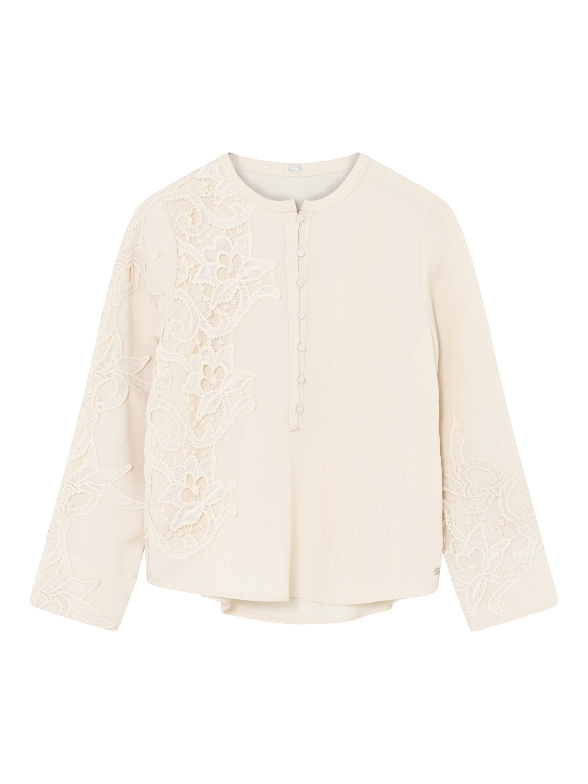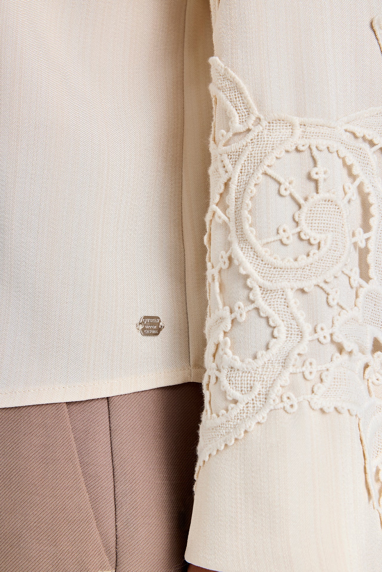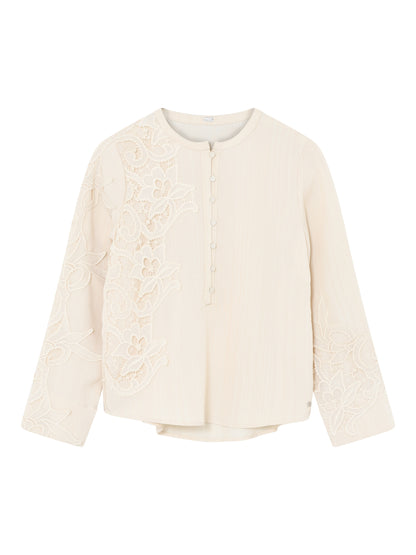 Feminin bluse fra Gustav i en varm beige farve. Blusen har det smukkeste vintage broderi på ærmer og ned langs venstre side. Ærmerne har en fin vidde og med til at give blusen sit elegante look. Style til mørke bukser, hvis du vil bruge den, når du skal i byen. Til hverdag er blusen flot til de brune Esta bukser.