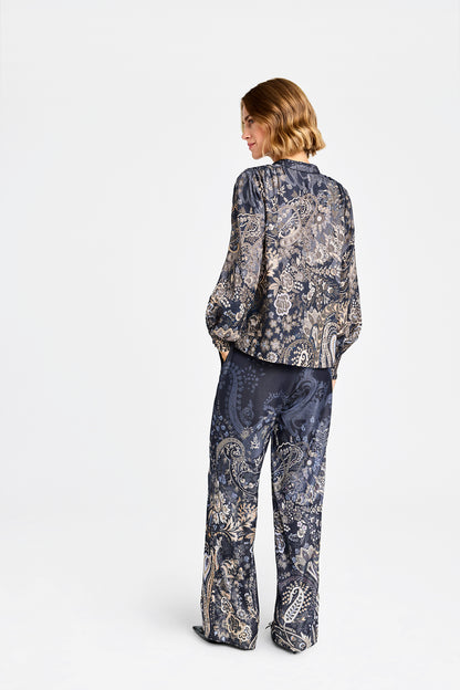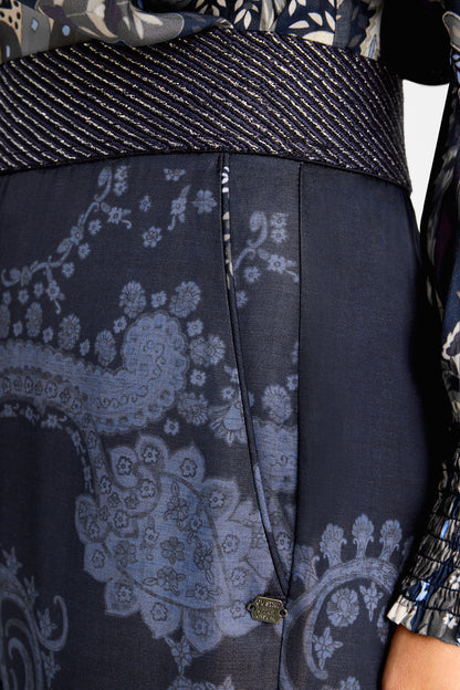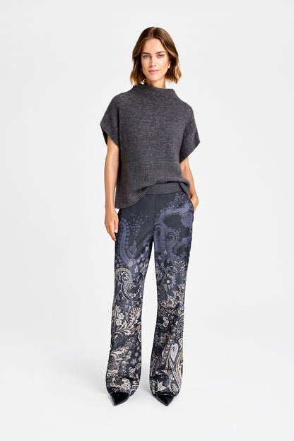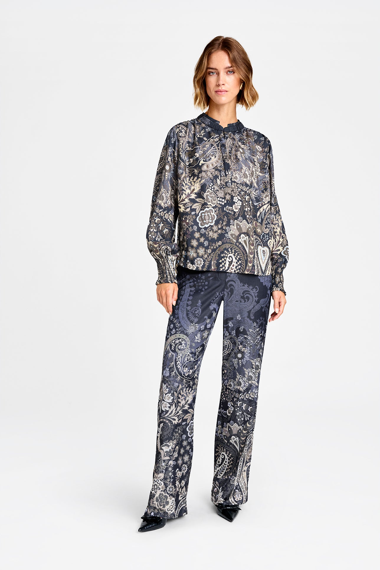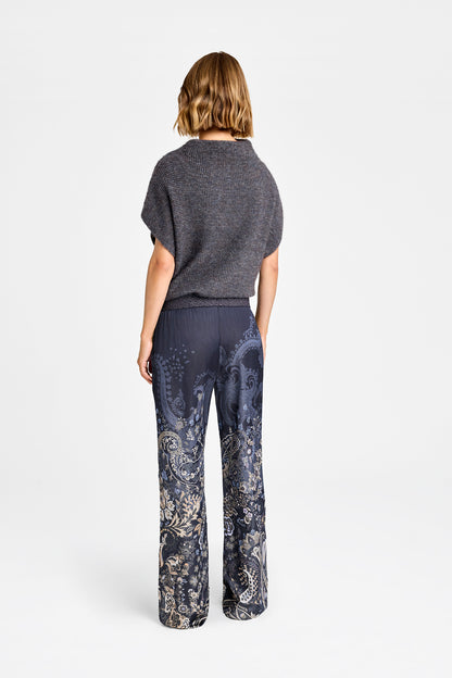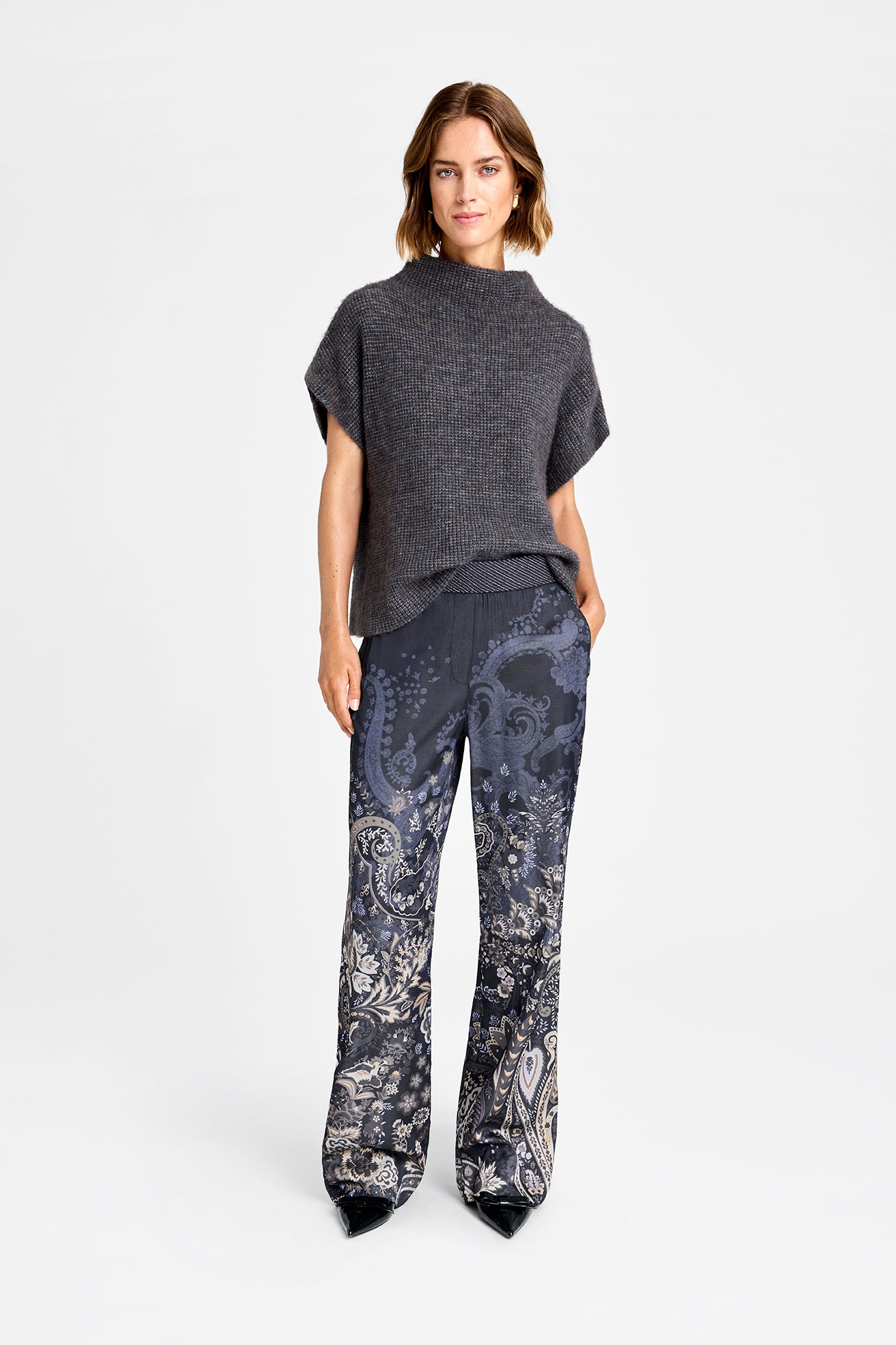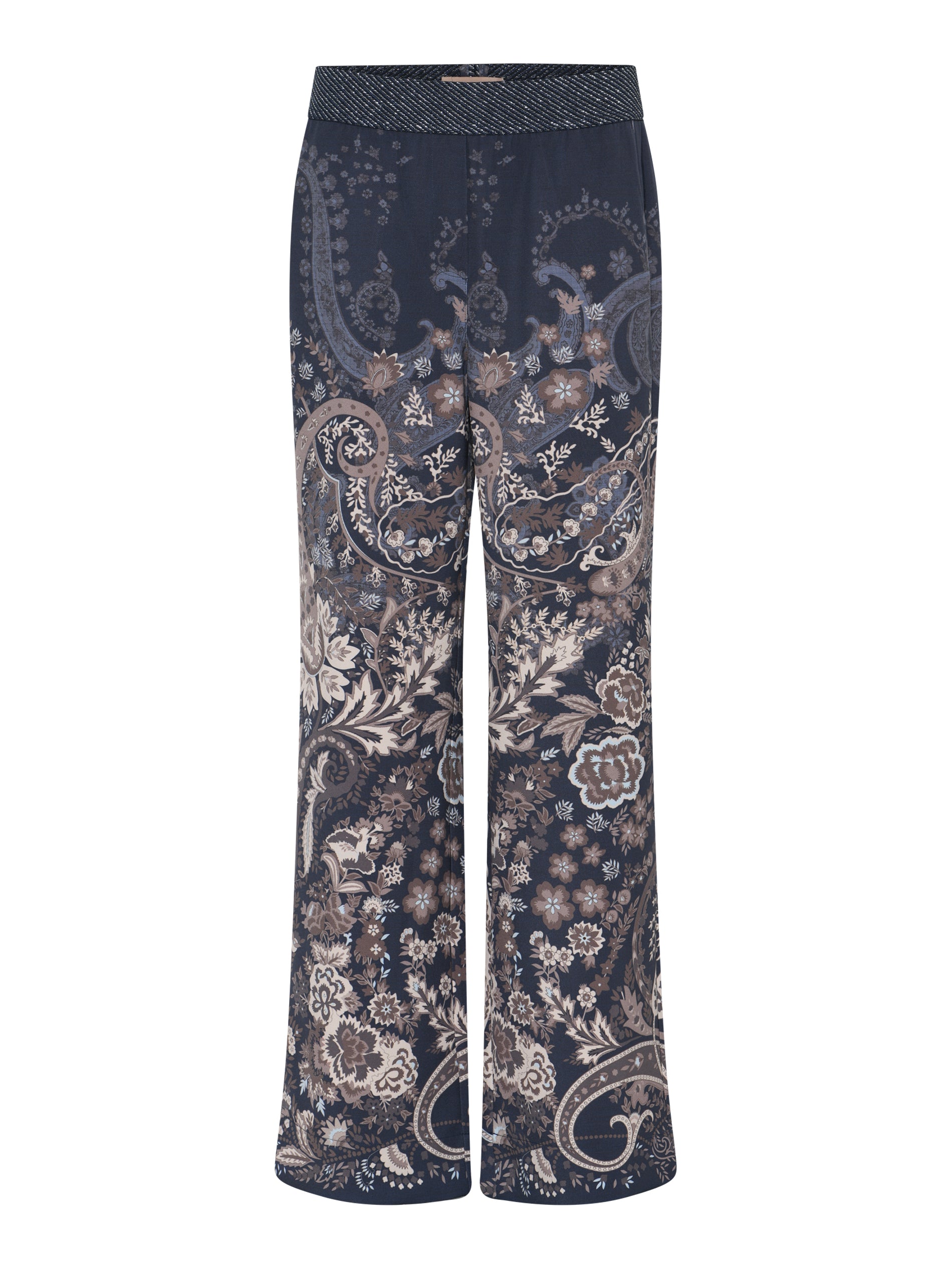 Den gode Bay er en af bestsellerne fra Gustav. Det fine print og den brede elastik i linningen kendetegner buksen og er med til at gøre den så populær. Du kan både gå all in på printet og style med den matchende Sikka bluse eller tone dit outfit mere ned med den fine Coya strik til. Mulighederne er mange og de de grå og blå toner i buksernes print er med til at åbne for flere måder at style på. Bay buksen har brede ben og skrålommer i siderne.