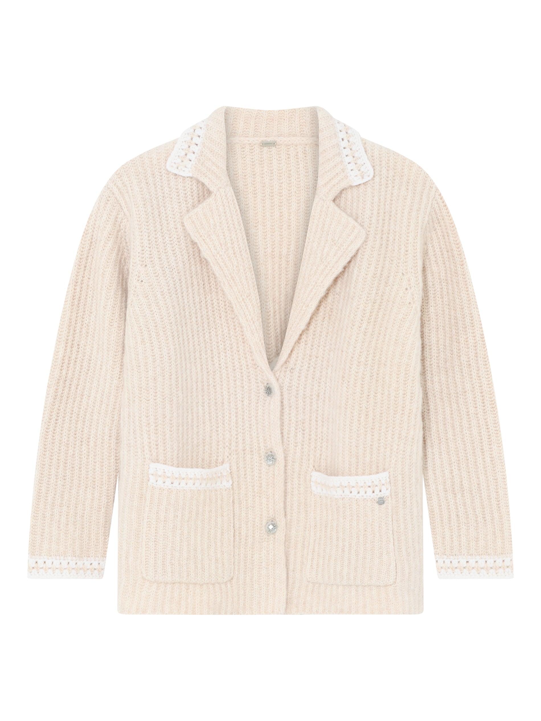 Fed strik cardigan fra Gustav i blazer stil. Cardiganen er lavet med revers, knapper og lommer præcis som en blazer, men i chunky strik. Det giver et super cool look, og bryder med hvordan både en cardigan og en blazer skal se ud. Style til et par lækre bukser med en blondebluse eller lille top under. Den gode blanding af bomuld, uld og alpaca gør cardiganen varm og blød at have på. Perfekt til både efterår og vinter.